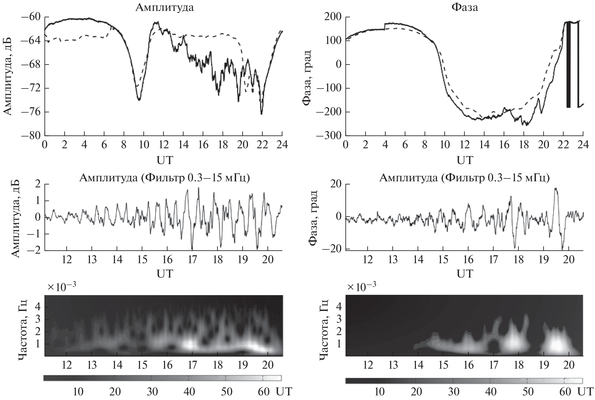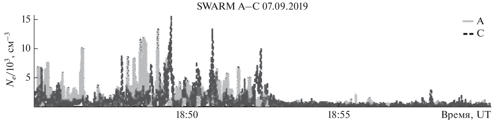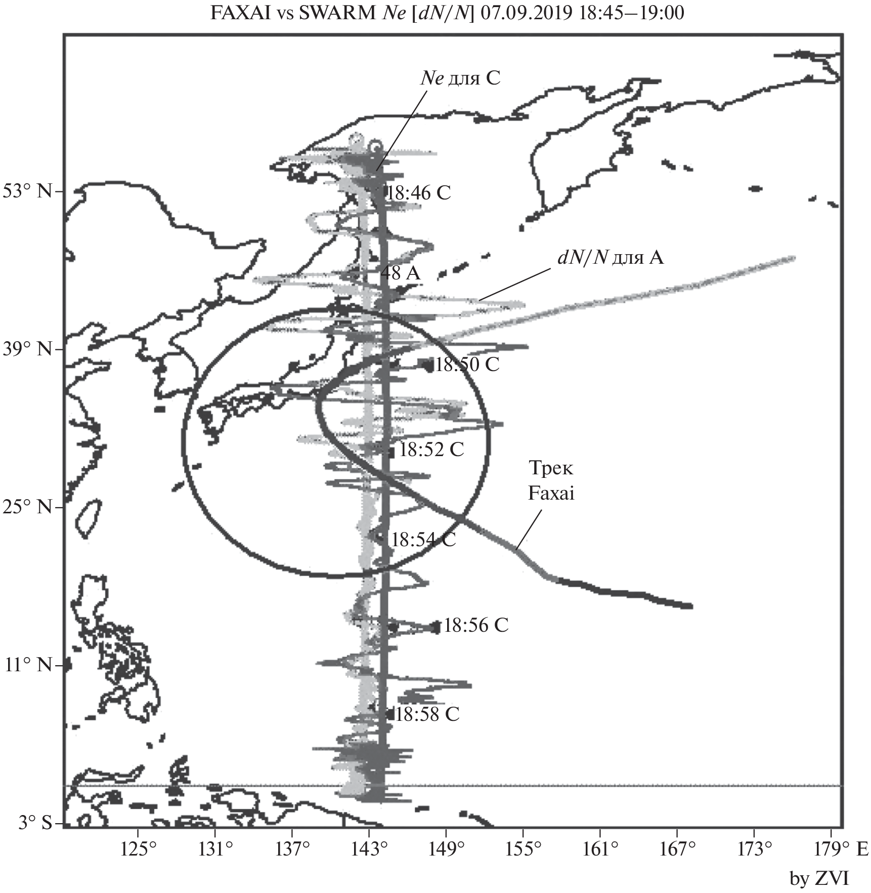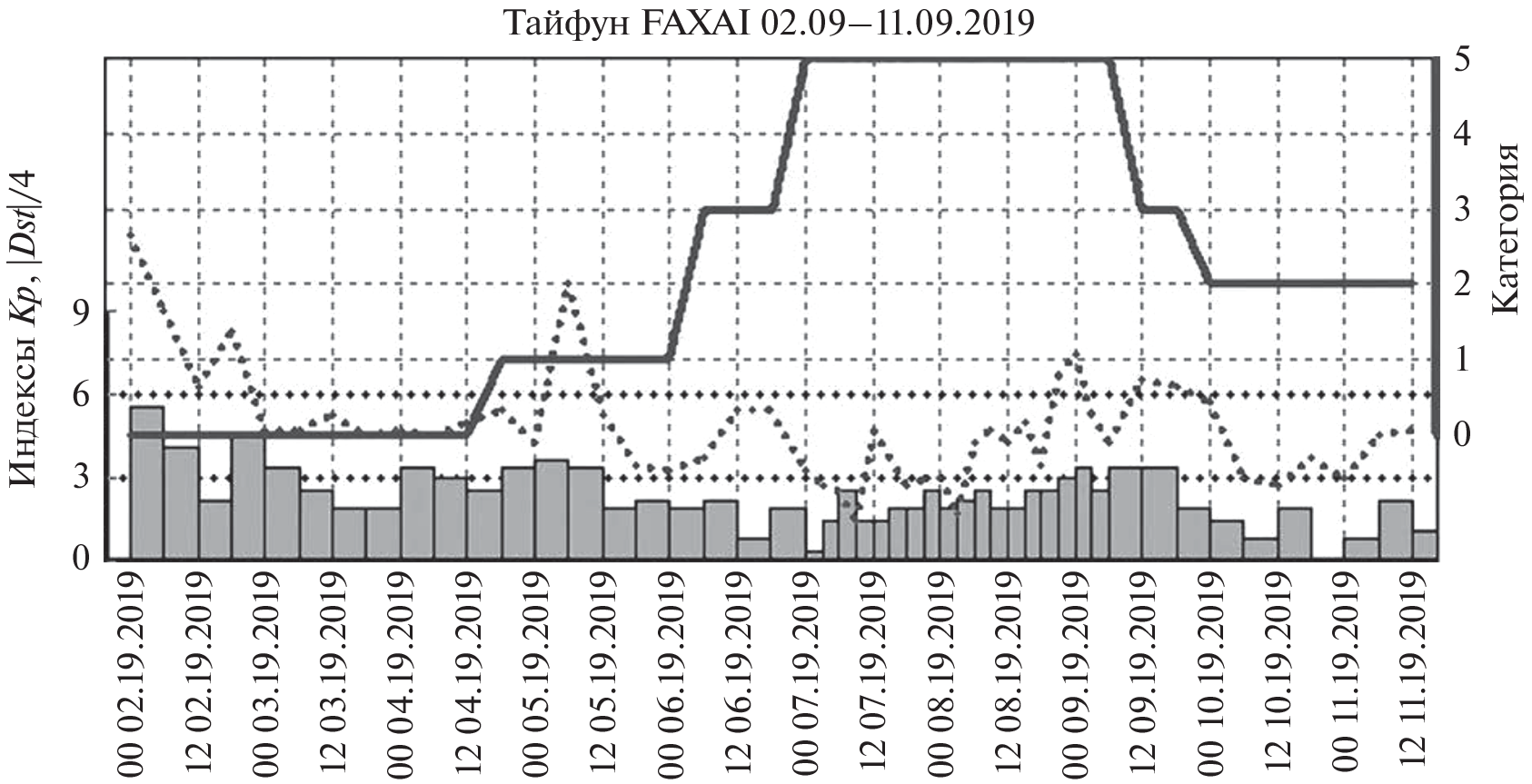 С использованием региональной сети станций сверхдлинноволнового радиопросвечивания в Дальневосточном регионе России и измерений возмущений электронной плотности посредством спутников миссии SWARM исследован отклик нижней и верхней ионосферы на прохождение тайфуна Faxai 2019 г. Приведенные экспериментальные данные отчетливо демонстрируют волновые возмущения амплитуды и фазы СДВ-сигнала, а также электронной плотности во время активной стадии тайфуна. Параметры волновых возмущений соответствуют атмосферным внутренним гравитационным волнам. Максимум спектральной плотности волновых возмущений в нижней ионосфере соответствует 16–20 мин. Предложен механизм воздействия внутренних волн на ионосферу, обусловленный поляризационными полями, возникающими при волновом движении плазмы в нижней части F-области. Такие поля, проецируясь вдоль силовых линий геомагнитного поля, позволяют интерпретировать наблюдаемые вариации фазы СДВ-сигнала и вариации электронной плотности в верхней ионосфере.