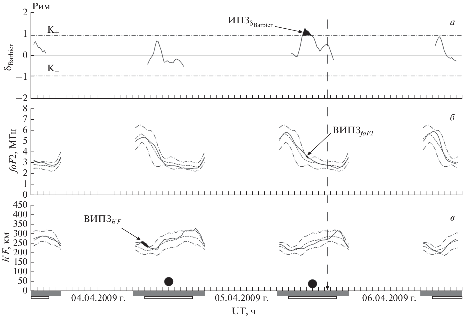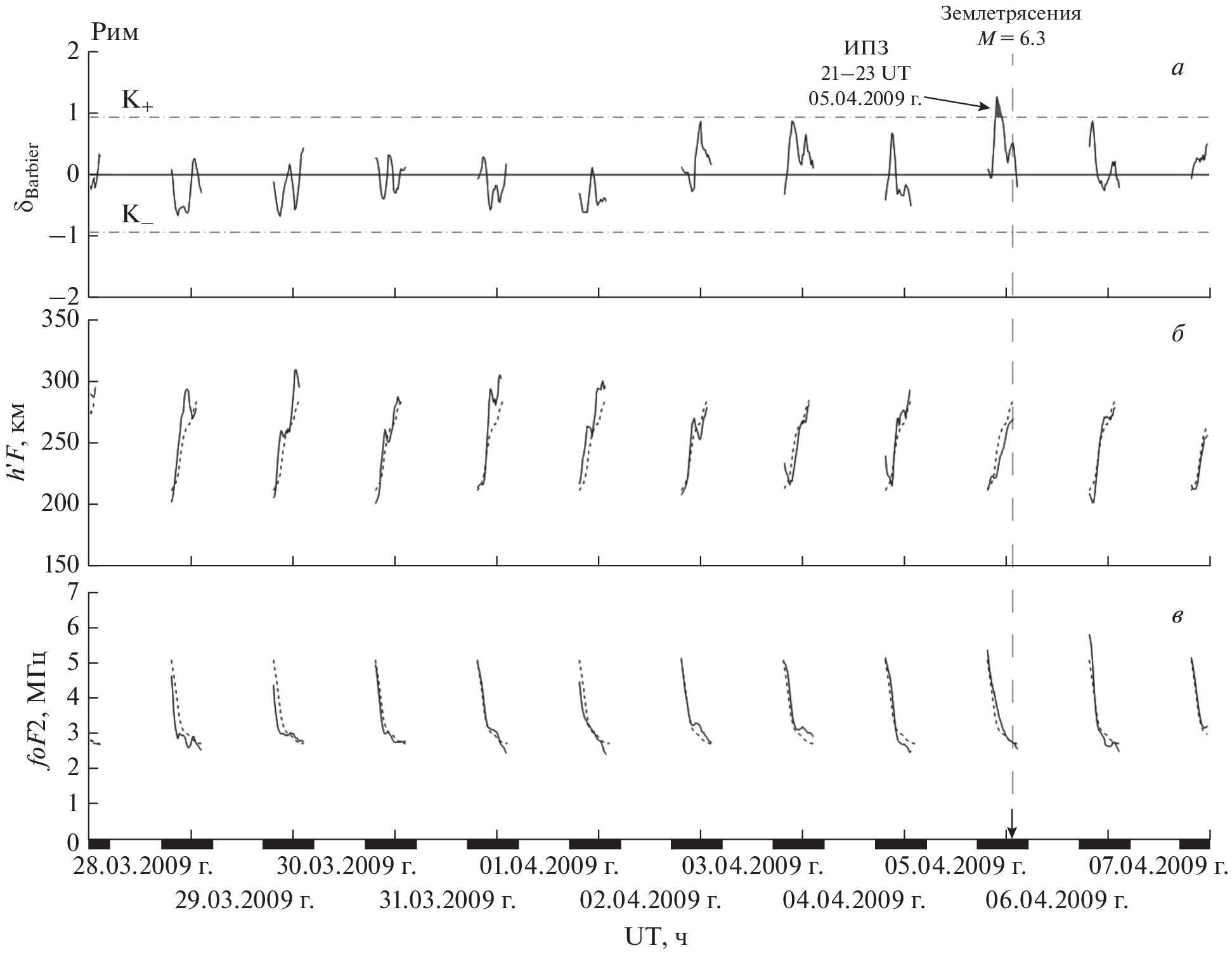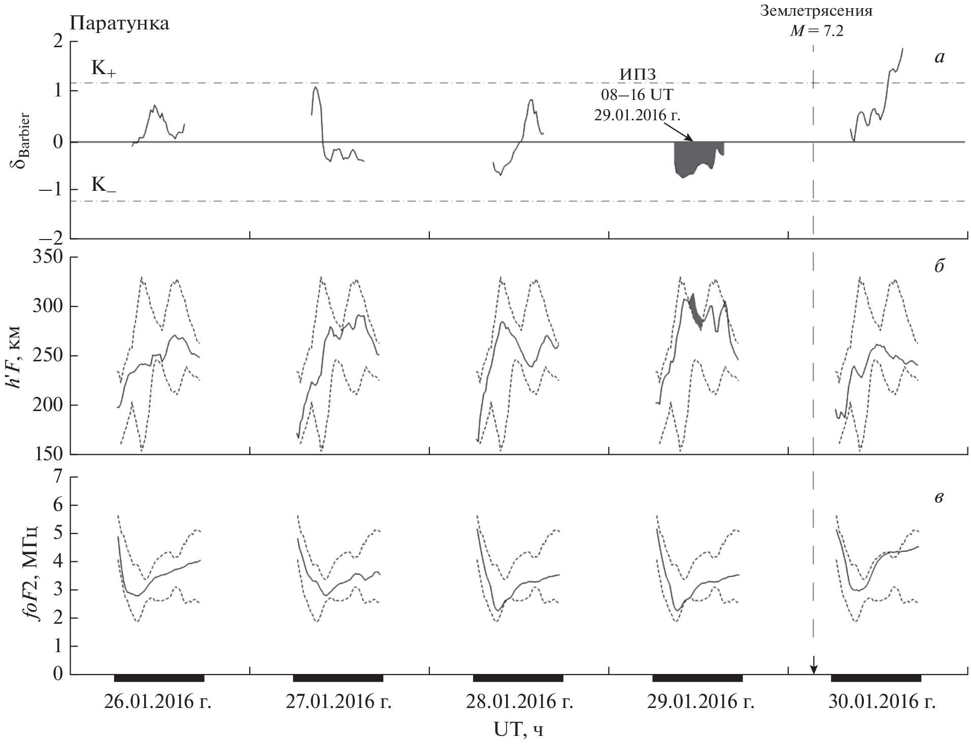Проведено исследование временны́х вариаций комплексного относительного δ-параметра Барбье (δBarbier) для оценки его эффективности при поиске ионосферных предвестников землетрясений. С этой целью было рассмотрено его поведение (по данным пятнадцатиминутных измерений ионосферных параметров) перед двумя сильными землетрясениями, для которых ионосферные предвестники землетрясений ранее уже были обнаружены. Первое землетрясение (с магнитудой M = 6.3) произошло 06.04.2009 г. (г. Л’Аквила, Италия) на эпицентральном расстоянии ~93 км от наземной станции вертикального зондирования ионосферы Рим, а второе (с магнитудой M = 7.2) случилось 30.01.2016 г., при этом его эпицентр оказался в ~117 км от наземной станции вертикального зондирования ионосферы, расположенной на территории комплексной геофизической обсерватории Паратунка, Камчатка. В обоих случаях в поведении параметра δBarbier были выделены специфические особенности, совпадающие по времени с ранее обнаруженными ионосферными предвестниками этих землетрясений. Это позволяет сделать вывод об успешной верификации эффективности использования параметра δBarbier при поиске ионосферных предвестников землетрясений.