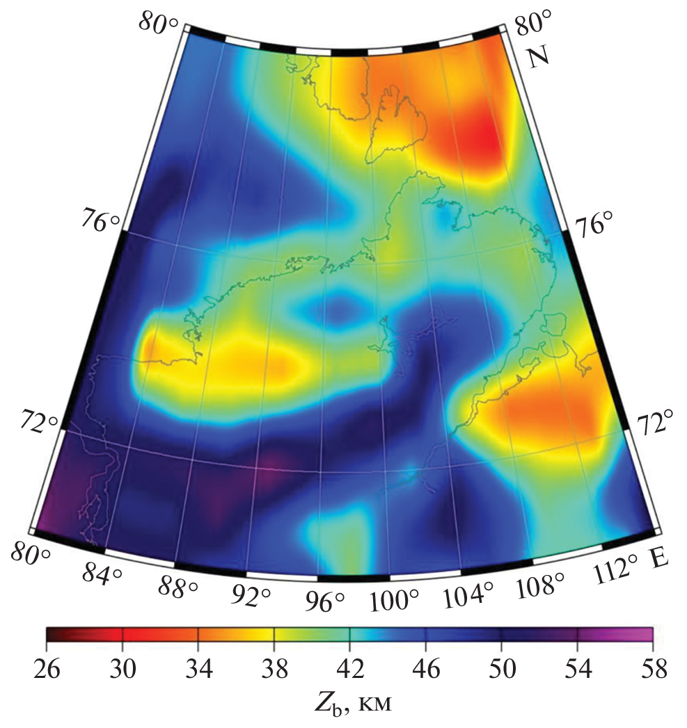 В статье представлены результаты исследования теплового режима литосферы под полуостровом Таймыр и сопредельными территориями (70°–80° N, 80°–115° E) по геомагнитным данным. Спектральный анализ аномального геомагнитного поля, заданного моделью EMAG2v3, выполнен с помощью метода центроида. Проведенные расчеты показали, что минимальные значения глубины верхней границы литосферных магнитных источников (<2.5 км) характерны для всего Таймырского складчатого пояса и рассматриваемой части Сибирской платформы, максимальные (>6 км) – для Северо-Карского бассейна. Положение верхней границы магнитоактивного слоя литосферы выше подошвы осадочного слоя под Енисей-Хатангским и Хатангско-Ленским бассейнами может быть связано с повсеместным внедрением в осадочный слой базальтовых траппов. Минимальные значения глубины нижней границы литосферных магнитных источников (<36 км) приурочены к Евразийскому бассейну и соседними с ним территориями шельфа моря Лаптевых и островов архипелага Северная Земля, что свидетельствует о наибольшем в пределах рассматриваемого региона прогреве литосферы под ними. Максимальных значений (≥48 км) глубина нижней границы достигает под Енисей-Хатангским, Северо-Карским бассейнами и Сибирской платформой, указывая на существование здесь холодной и, соответственно, мощной литосферы, что подтверждается другими независимыми геофизическими данными.