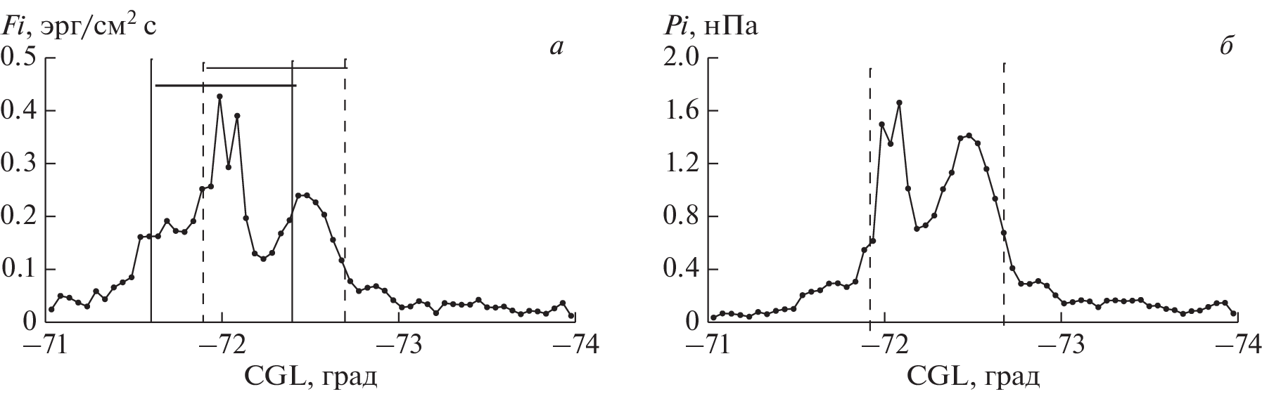 The results of observations of low-altitude spacecraft crossing the daytime sector of the auroral zone and of high-apogee spacecraft in the equatorial plane of the magnetosphere were analyzed in order to identify the main processes leading to the formation of dayside polar cusps. Observations from the DMSP F7 spacecraft were used to analyze the latitudinal characteristics of ion precipitation in the cusp region and to study the latitudinal profile of ion pressure in the cusp depending on the IMF parameters. A significant difference was found in identifying the cusp boundaries using an automated data processing system and direct analysis of spacecraft observations. It is shown that for small negative values of the Bz-component of the IMF (〈Bz〉 = –3.0 nT), an ordinary feature of the cusp is the latitudinal profile of the ion pressure (Pi) with a width of ~1° of latitude with two maxima, one of which is located in the equatorward and the other in the poleward of the cusp. For large negative Bz values (–6, –8 nT), the polar maximum in the latitudinal profile Pi disappears; only the equatorial maximum remains, the Pi level at the maximum increases, and the width of the cusp decreases to ~0.7°. For Bz IMF > 0, the most characteristic is the Pi profile with a maximum ion pressure in the polar part of the cusp. The cusp for Bz > 0 is located at higher latitudes than for Bz < 0, and its average latitudinal width increase to ~1.4° of latitude. In the prenoon sector MLT, the most typical for periods with a large negative By-component of the IMF (〈By〉 = –6.3 nT, 〈Bz〉 = –1.7 nT) is a cusp with a width of ~1.4° of latitude with a flat top in the latitudinal Pi profile. Comparison of the pressure distributions observed at low heights with data from high-apogee satellites confirmed the possibility of describing the formation of the cusp as a diamagnetic cavity and using observations in the cusp to determine the ion pressure in the magnetosheath.