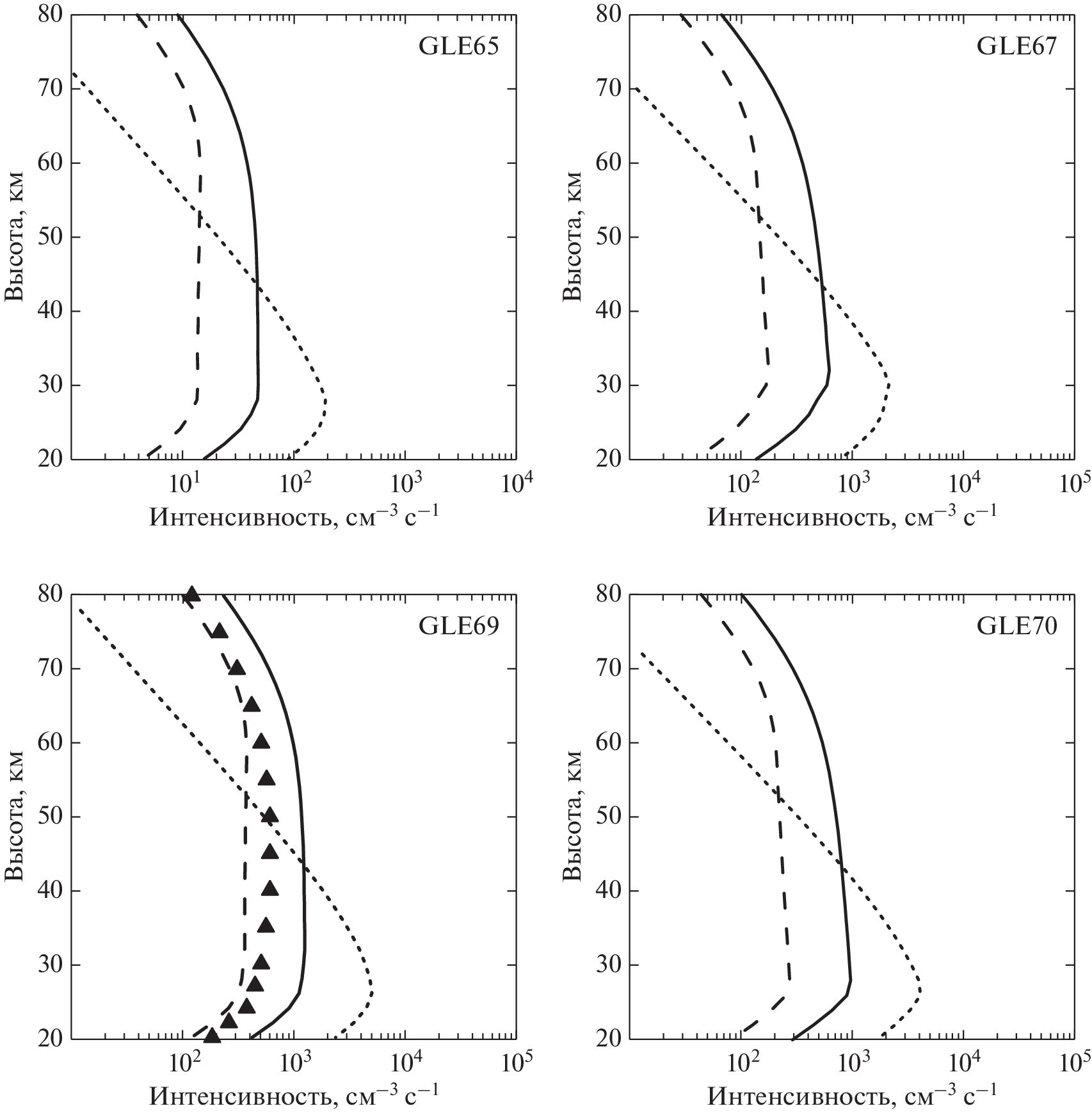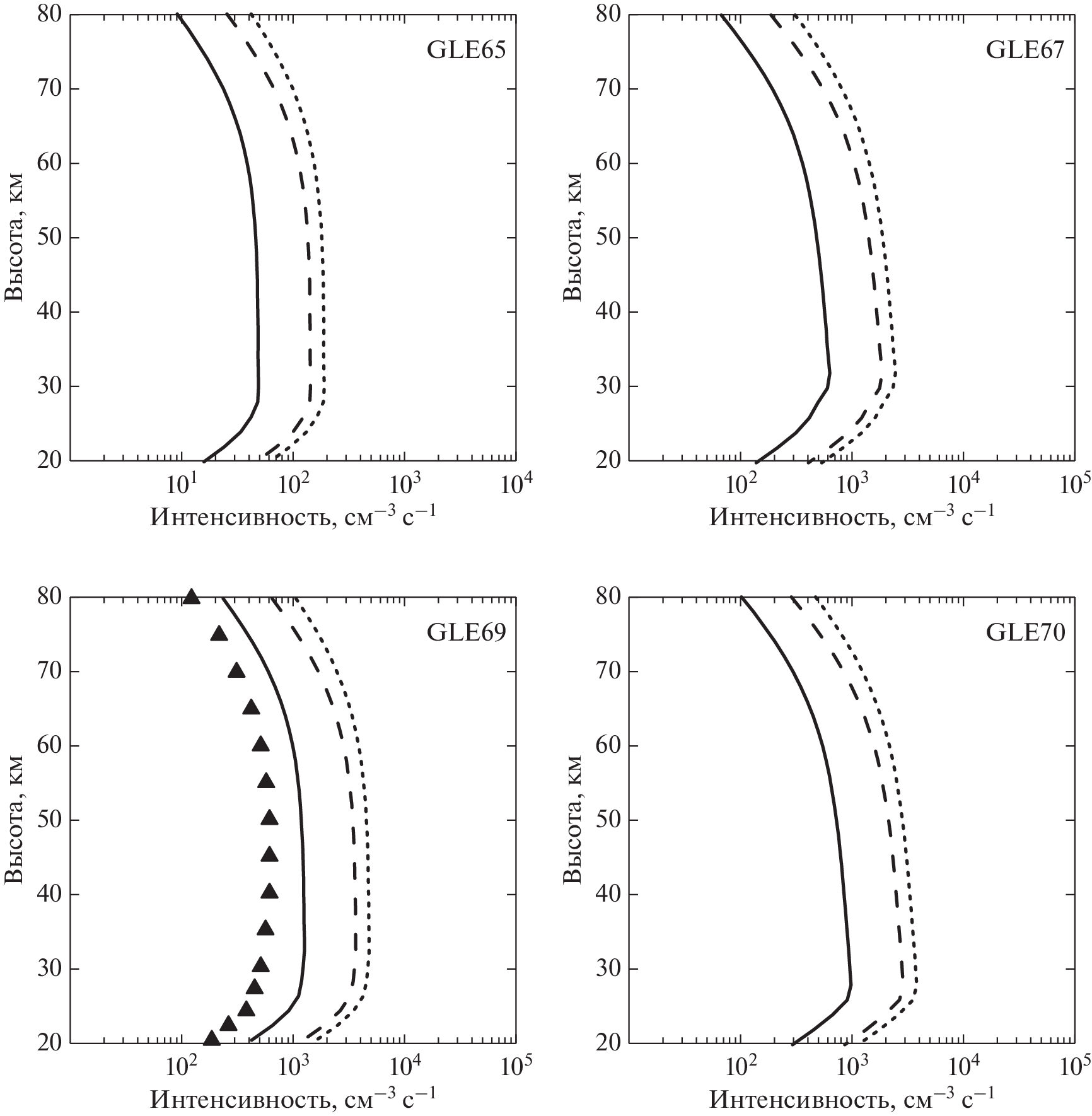 Рассмотрена кинетика образования колебательно-возбужденных молекул NO(X2Π, v > 0) на высотах средней атмосферы Земли во время высыпания высокоэнергичных протонов. Проведен расчет профилей интенсивностей свечения инфракрасных полос окиси азота 5.3 мкм и 2.7 мкм в случае высыпания в атмосферу Земли высокоэнергичных протонов во время событий GLE65, GLE67, GLE69, GLE70 23-го солнечного цикла. Расчеты показали, что наибольшие значения интегральной интенсивности свечения полос 5.3 мкм и 2.7 мкм получаются для GLE69 и составляют 5.7 кР (килорэлей) и 0.18 кР соответственно. Сравнение результатов расчета для полосы 5.3 мкм во время события GLE69 с экспериментальными данными, полученными с космического летательного аппарата TIMED 20 января 2005 г., показало завышение результатов расчета в два раза.