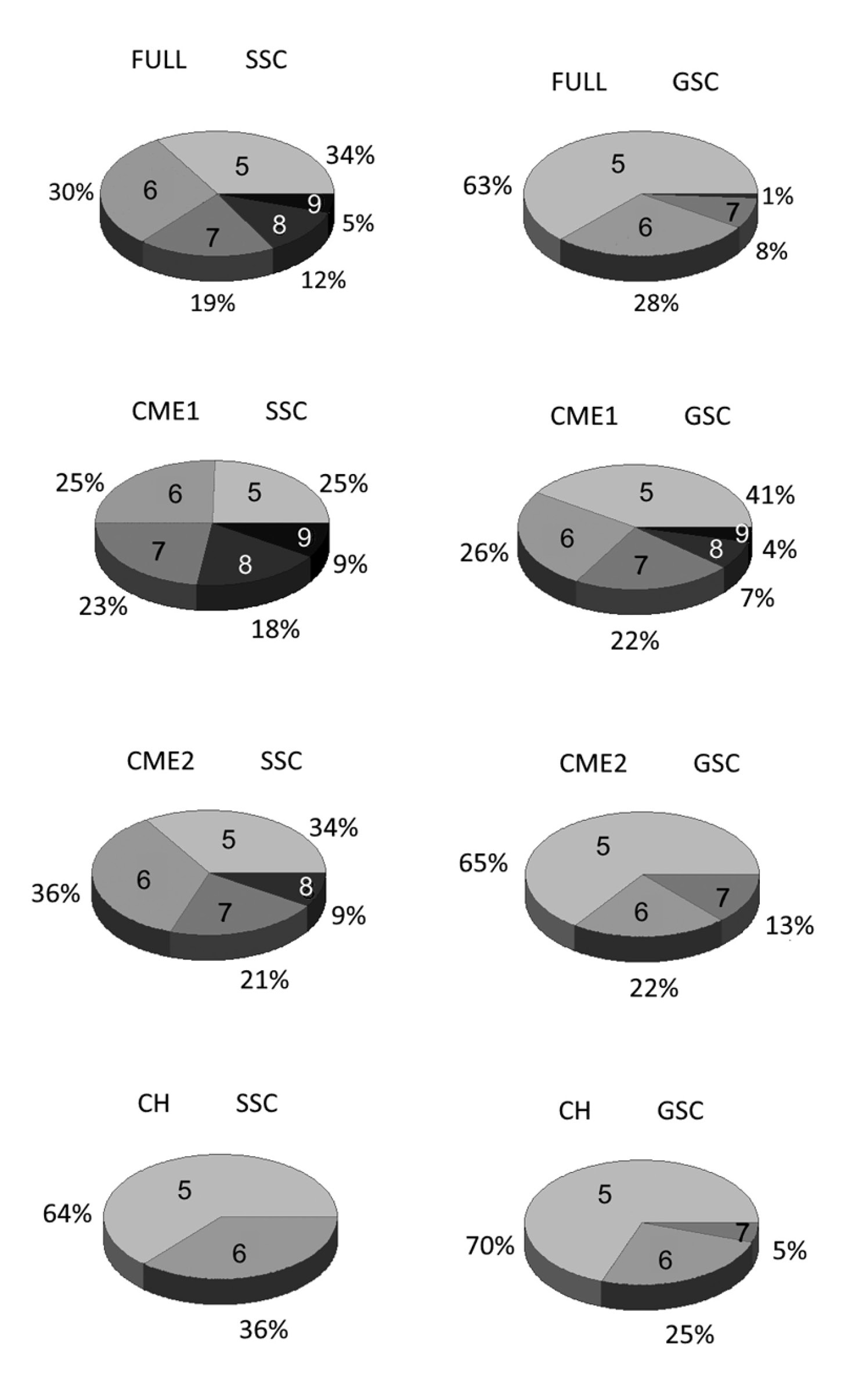 Рис. 1. Круговые диаграммы параметра Kpmax в группах FULL, СМE1, СМЕ2, СН для событий с внезапным (SSC) и постепенным (GSC) началом (Kpmax ≥ 5—).