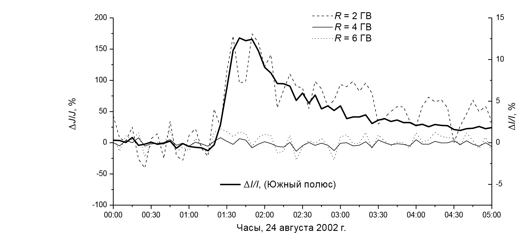 На рис. 1 приведены временной ход изотропного потока первичных протонов разной жесткости и относительная интенсивность вторичных нейтронов, зарегистрированных НМ на ст. Южный Полюс. Возрастание интенсивности частиц с жесткостью 2 ГВ наблюдается с 01:15 до 01:50 UT и совпадает с ростом интенсивности вторичных нейтронов на ст. Южный Полюс.