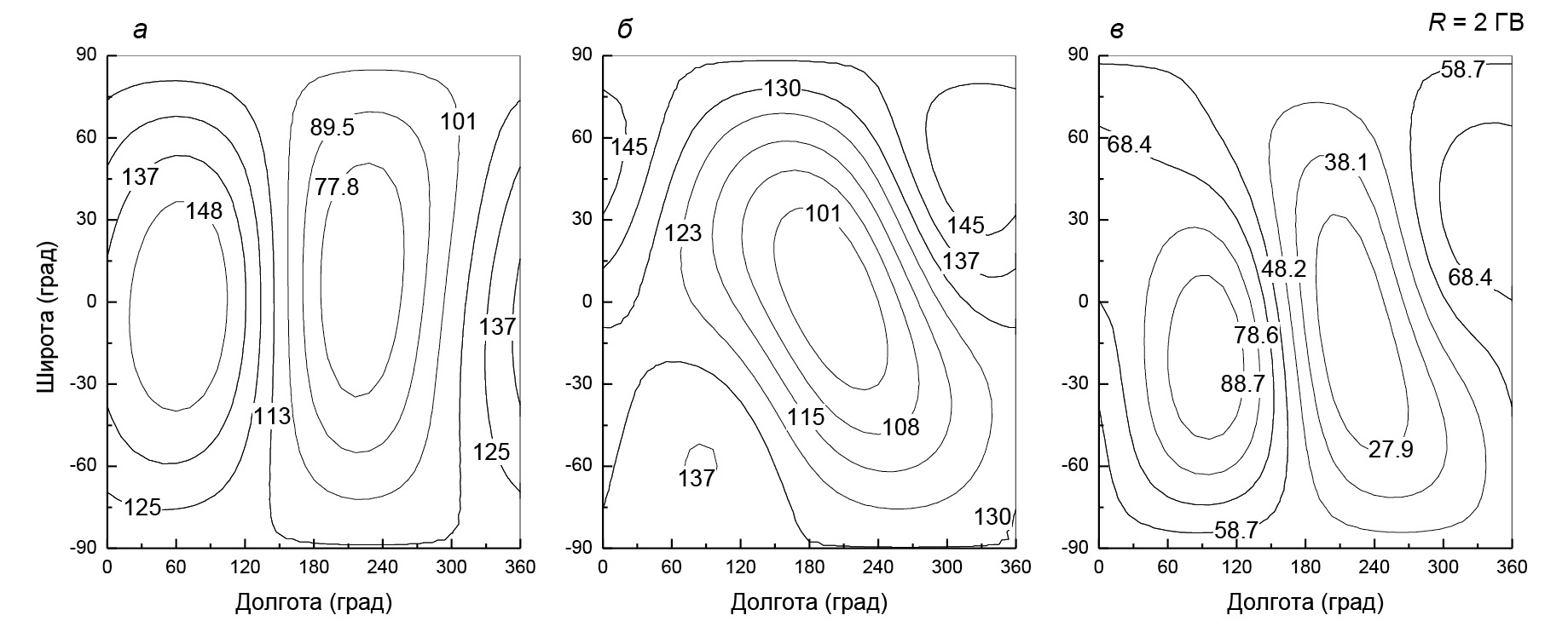 На рис. 2 изолиниями показано пространственное распределение КЛ с жесткостью 2 ГВ в солнечно-эклиптической геоцентрической системе координат в отдельные моменты развития исследуемого GLE. По оси абсцисс отложены значения долготного угла (ϕ), а по оси ординат —широтного угла (λ). В представленные моменты времени наблюдается ярко выраженная первая гармоника питч-угловой анизотропии с повышенным потоком частиц из направления ϕ ~ 60°, λ ~ 0°. Отсутствие второй гармоники питч-угловой анизотропии (А2) в этом событии в рамках модели модуляции КЛ регулярными электромагнитными полями гелиосферы [Дворников и др., 2013] объясняется тем, что в это время структуры межпланетного магнитного поля (ММП) в виде петли не сформировалось.