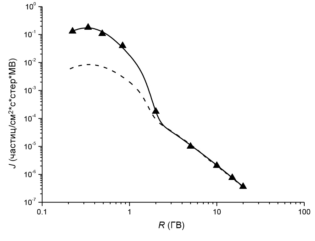 Рис. 3. Дифференциальные жесткостные спектры первичных протонов, рассчитанные по 5-минутным данным. Сплошная линия — расчетный спектр в момент GLE (01:50 UT), штриховая линия — расчетный спектр перед GLE (00:00 UT). Треугольниками отмечены наблюдаемые данные GOES-10 (для жесткостей ниже 1 ГВ) и данные наземных наблюдений КЛ (для жесткостей выше 1 ГВ) в момент GLE.