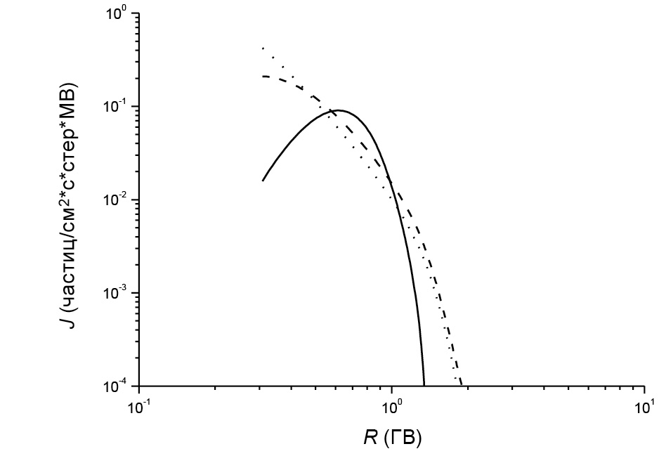 Рис. 4. Дифференциальные жесткостные спектры ускоренных на Солнце частиц в отдельные моменты GLE64: перед событием (01:30 UT, сплошная линия), на максимуме интенсивности КЛ (02:00 UT, штриховая линия), после события (02:50 UT, пунктирная линия).