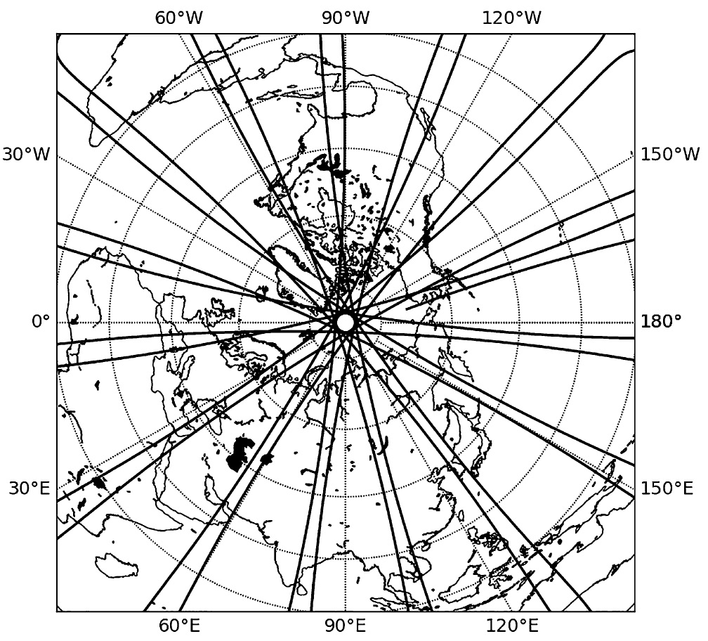 На рис. 1 видно, что на единицу площади в высоких широтах приходится гораздо больше точек измерения. Также видно, что для получения более или менее равномерного покрытия всей поверхности требуются данные в течение нескольких дней, а внешние источники могут измениться за это время, и полностью отделить их от внутренних может оказаться невозможным.