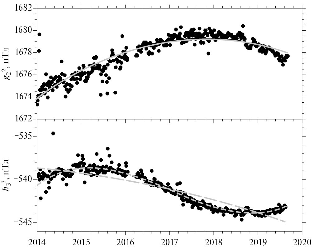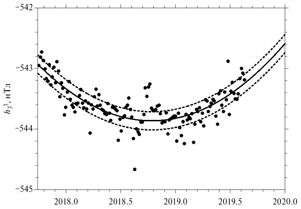 Соответственно, использование разных методов аппроксимации даже при интерполяции на 4 месяца вперед может дать различные значения. Например, для показанной на рис. 3 гармоники h33 различные методы аппроксимации при экстраполяции даже на 3 месяца дают результаты от –546 до –542 нТл. Для получения модели на 01.01.2020 г. мы решили использовать данные только за последние 2 года. Значения коэффициентов рассчитывались как параболически-экстраполированные данные за интервал 01.09.2017 г. — 31.08.2019 г. Для каждой сферической гармоники использовалась трехпроходная параболическая аппроксимация данных. После первой аппроксимации точки с отклонением более двух стандартных отклонений от полученной параболы были исключены, и следующая аппроксимация производилась на основе оставшихся данных. Эту процедуру повторяли 3 раза. На рис. 4 показаны все имеющиеся точки, но точки выше и ниже пунктирных линий в процессе аппроксимации были исключены, и окончательно парабола подбиралась только по точкам между пунктирными линиями.