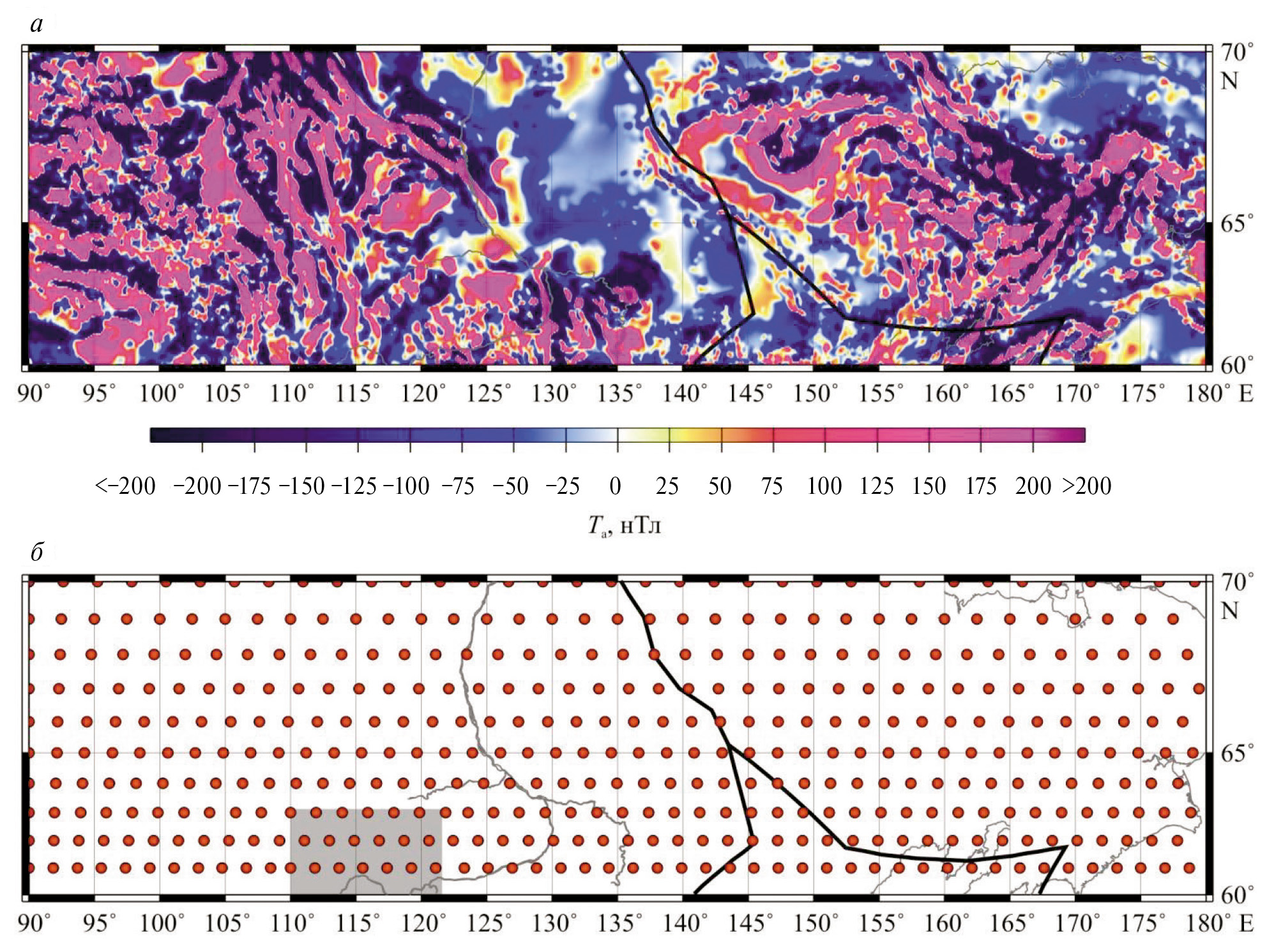 Бо́льшая часть имеющейся на текущий момент времени информации о литосферных температурах на северо-востоке Евразии основывается на результатах поверхностно-волновой томографии [Cammarano and Guerri, 2017; Lebedev et al., 2017; Priestley et al., 2019], которые характеризуются горизонтальным разрешением в несколько сотен километров. При этом количество измерений поверхностного теплового потока, представляющего собой основные исходные данные для температурной модели TC1 [Artemieva, 2006], для рассматриваемой территории невелико, а распределение пунктов измерений весьма неравномерно (см. далее раздел 4.1) [Fuchs et al., 2021a, b]. Таким образом, для исследуемого региона большой интерес представляют независимые косвенные оценки глубинных температур. В частности, для этих целей широко используются подходы, основанные на анализе геомагнитных данных [Carillo-de la Cruz et al., 2021; Correa et al., 2022; Oliveira et al., 2021; Prasad et al., 2022; Sobh et al., 2021; и др.]. Причем накопленный к настоящему моменту объем разновысотных магнитных съемок, включая спутниковые наблюдения, позволяет проводить исследования даже в труднодоступных приполярных районах Земли [Середкина и Филиппов, 2021; Филиппова и Филиппов, 2022, 2023а, б; Gaudreau et al., 2019; Lu et al., 2022; Maule et al., 2005].