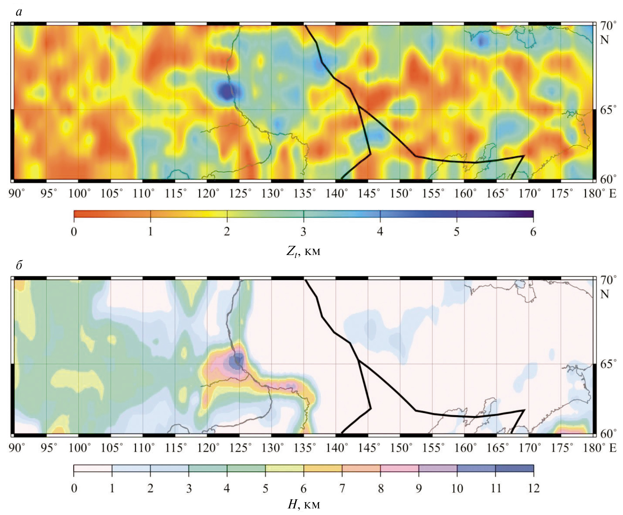 Для большей части северо-востока Евразии глубина Zt не превышает 2 км, полный диапазон изменения Zt составляет 0.1—5.5 км (рис. 3а). С учетом погрешностей увеличение Zt уверенно прослеживается под Линденской впадиной и примыкающей к ней частью Предверхоянского краевого прогиба (см. рис. 1), которые входят в состав Лено-Вилюйской газонефтеносной провинции. Принимая, что намагниченность осадочных пород существенно меньше намагниченности пород кристаллического фундамента [Яновский, 1978], такое увеличение глубины Zt на качественном уровне согласуется с глобальной моделью строения коры CRUST1.0, согласно которой мощность осадков в обсуждаемом районе доходит до 7—10 км (рис. 3б). Бо́льшая часть Сибирской платформы характеризуется глубинами Zt <1.5 км (рис. 3а), в отличие от моделей CRUST1.0 (рис. 3б) и SibCrust [Cherepanova et al., 2013], а также результатов работы [Petrov et al., 2016], в которых мощность осадков достигает 6 км под отдельными локальными областями на платформе. Выявленное несоответствие может быть связано с широким распространением базальтовых траппов в осадочном чехле платформы [Drachev et al., 2010]. Полученное распределение глубины верхней границы магнитоактивного слоя литосферы указывает на большее распространение осадочного слоя под складчатыми поясами на северо-востоке Евразии, чем модель CRUST1.0, плохо обеспеченная здесь исходными данными. Косвенно на это также указывают пониженные значения групповых скоростей волн Рэлея на периоде 20 с [Середкина, 2019; Levshin et al., 2001].