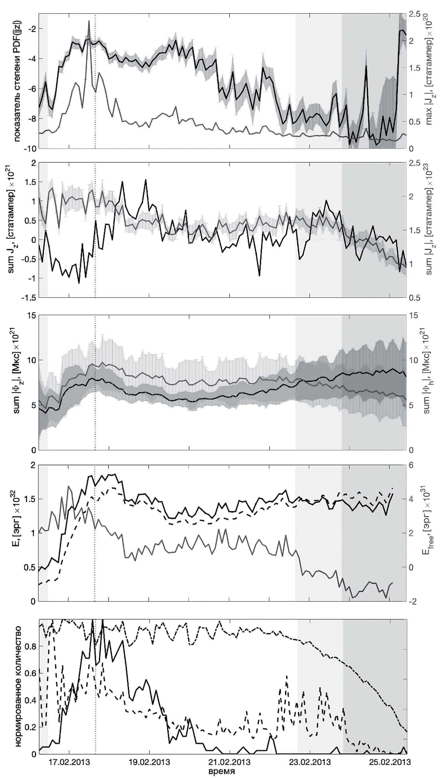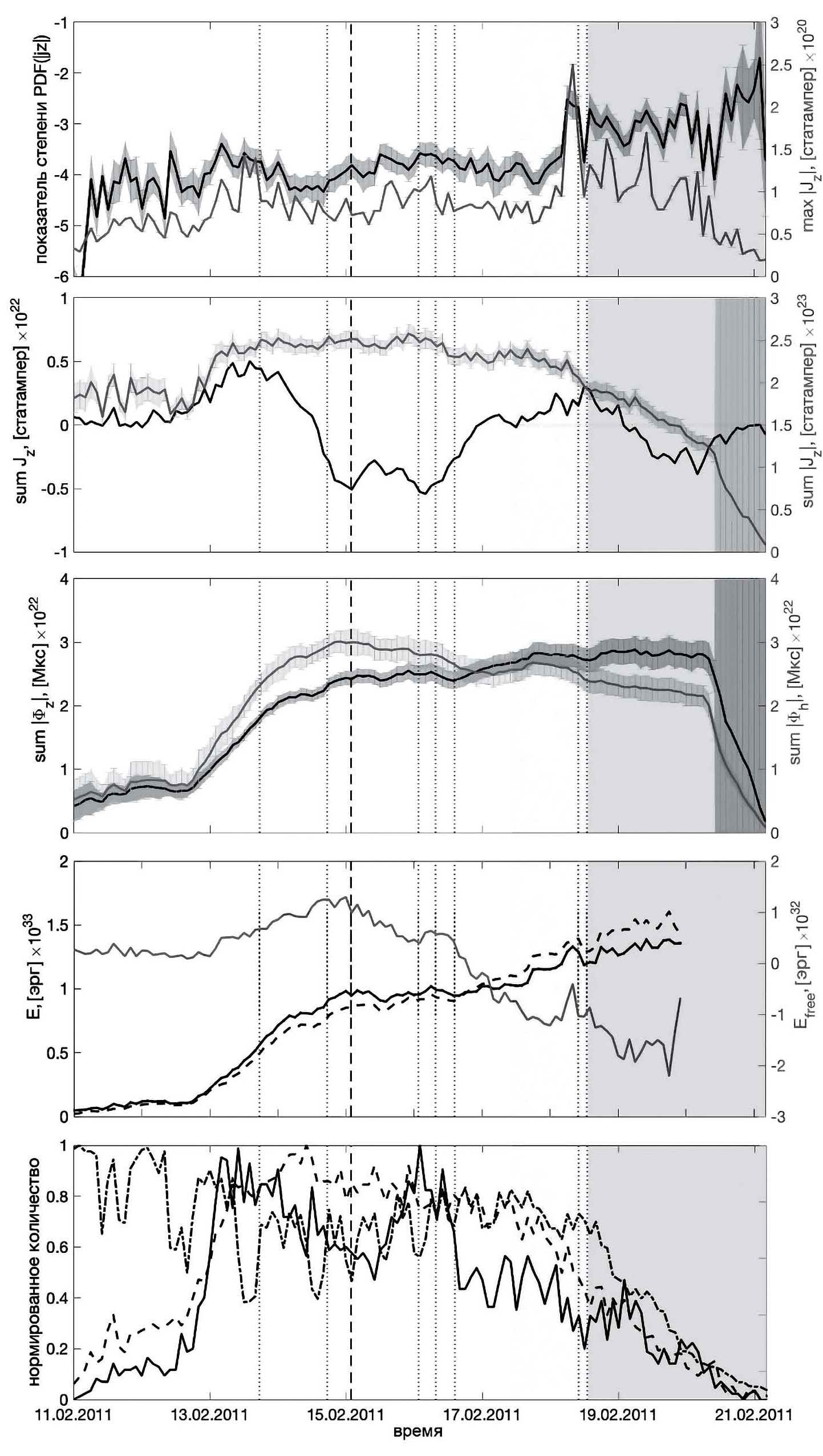 Кривые эволюции (зависимости от времени) перечисленных параметров с ошибками их вычисления, основанными на информации об ошибках компонент вектора магнитного поля (в данных SHARP), представлены на рис. 1 для АО 11158, на рис. 2 для АО 11675, на рис. 3 для АО 12673. Отметим, что ошибки магнитных энергий не приводятся по причине практической невозможности их расчета. На рис. 1—3 первая (верхняя) панель: показатель степени PDF(|jz|) (черная кривая) и максимум абсолютного значения вертикального тока max|Jz| (серая кривая). Вторая панель: знаковая (черная кривая) и беззнаковая (серая кривая) суммы вертикального тока sumJz и sum|Jz| соответственно. Третья панель: суммарные беззнаковые потоки вертикального (черная кривая) и горизонтального (серая кривая) магнитного поля sum|Φz| и sum|Φh|, соответственно. Четвертая панель: энергия нелинейного бессилового Enlfff (черная сплошная кривая) и потенциального Epotf (черная пунктирная кривая) магнитного поля, свободная магнитная энергия Efree (серая сплошная кривая). Пятая панель: нормированное количество островов (отдельных участков АО) с плотностью вертикального тока |jz| > 3×103 статампер/см2 (штрихпунктирная кривая), |jz| >9×103 статампер/см2 (пунктирная кривая) и |jz| > 18 · 103 статампер/см2 (сплошная кривая). Цвета кривых соответствуют цветам осей ординат, на которых показаны их значения. Серые участки на графиках выделяют те интервалы времени, где достоверность значений параметров сомнительна из-за удаленности центра АО от центрального меридиана (в диапазоне гелиодолгот 45°–60° — светло-серый цвет, выше 60° градусов — темно-серый цвет). Вертикальные точечные и пунктирные линии показывают время пика вспышек М и Х классов соответственно.