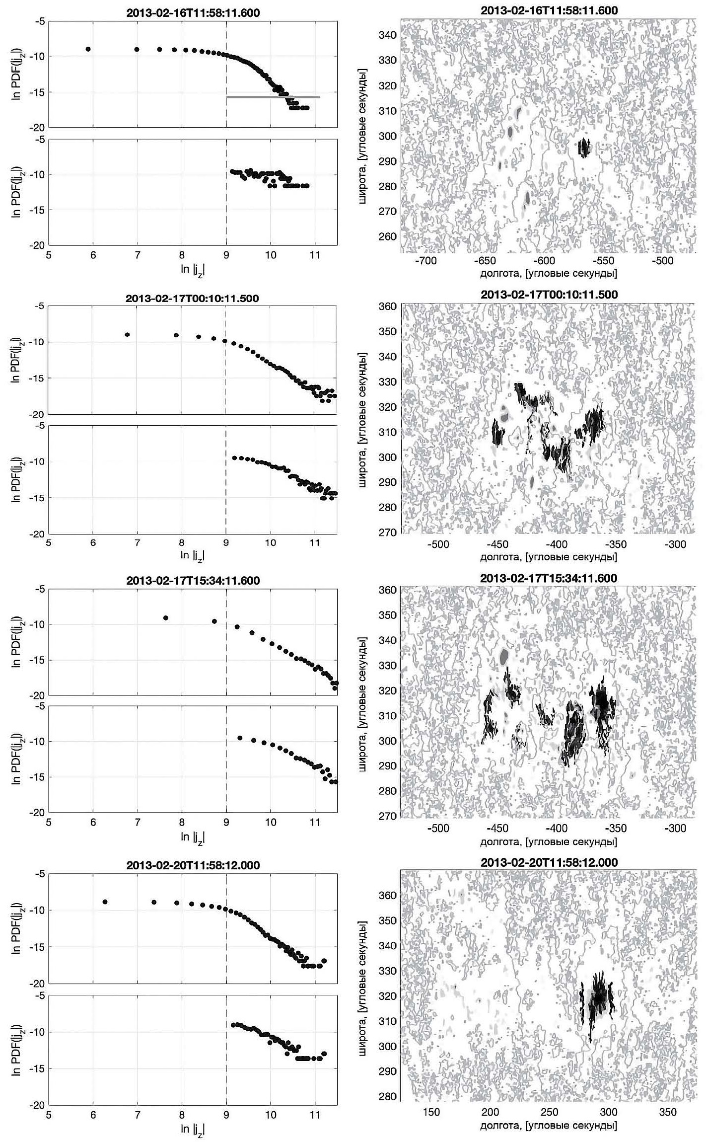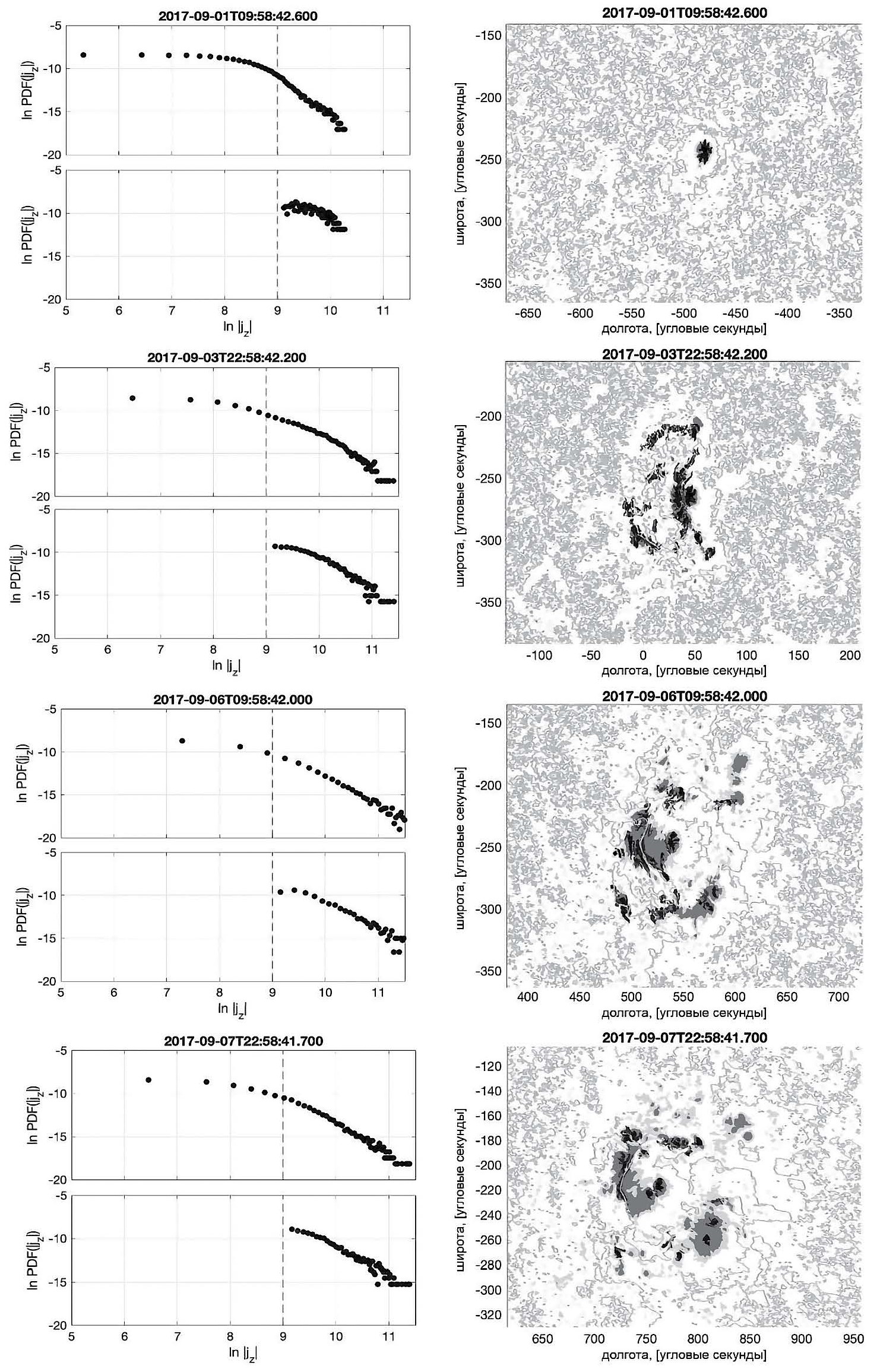 Рис. 4. PDF(|jz|) (слева) и карты островов сильного электрического тока (справа) для четырех моментов времени (сверху вниз): в начале зарождения АО, на фазе быстрого всплытия магнитного потока, перед началом самых мощных вспышек и в один из более поздних моментов времени для АО NOAA 11158.