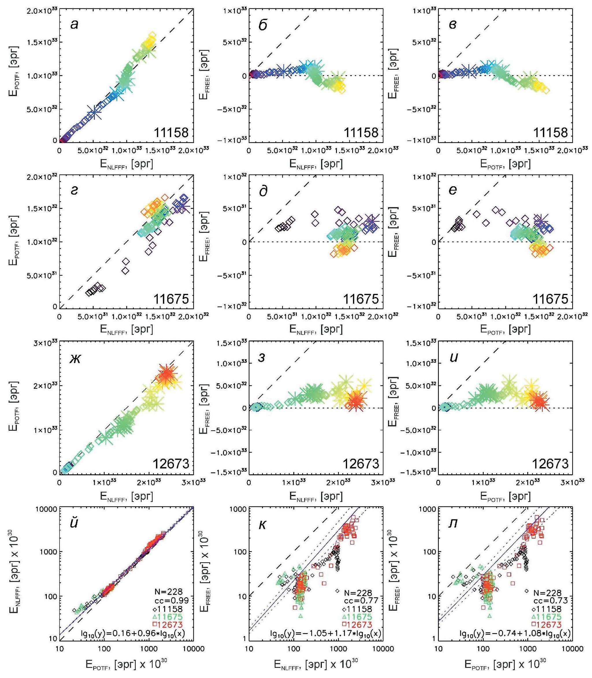 - среди рассмотренных пар характеристик коэффициенты корреляции самые большие для энергий потенциального и нелинейного бессилового магнитных полей — от 0.94 (в АО 11675) до 0.99 (в АО 11158 и 12673). Получено регрессионное соотношение между этими типами магнитной энергии. При этом свободная магнитная энергия коррелирует хуже с энергиями потенциального и нелинейного бессилового поля для мощных АО 11158 и 12673 и не коррелирует с ними для более слабой АО 11675;