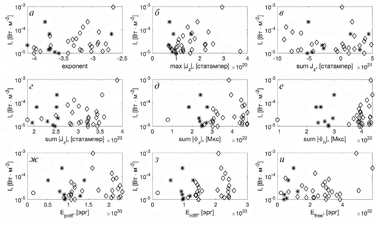 Тест Колмогорова—Смирнова для двух выборок точек (звездочек и квадратов на рис. 9г) указывает на то, что с большой вероятностью они принадлежат к одному множеству, т. е. статистически идентичны. Это может предварительно указывать на то, что нет принципиальной разницы в точности прогнозирования максимального балла вспышки (на основе этого подхода) по усредненным данным об энергии потенциального магнитного поля за предыдущие сутки или по данным за ближайшие 2 ч.