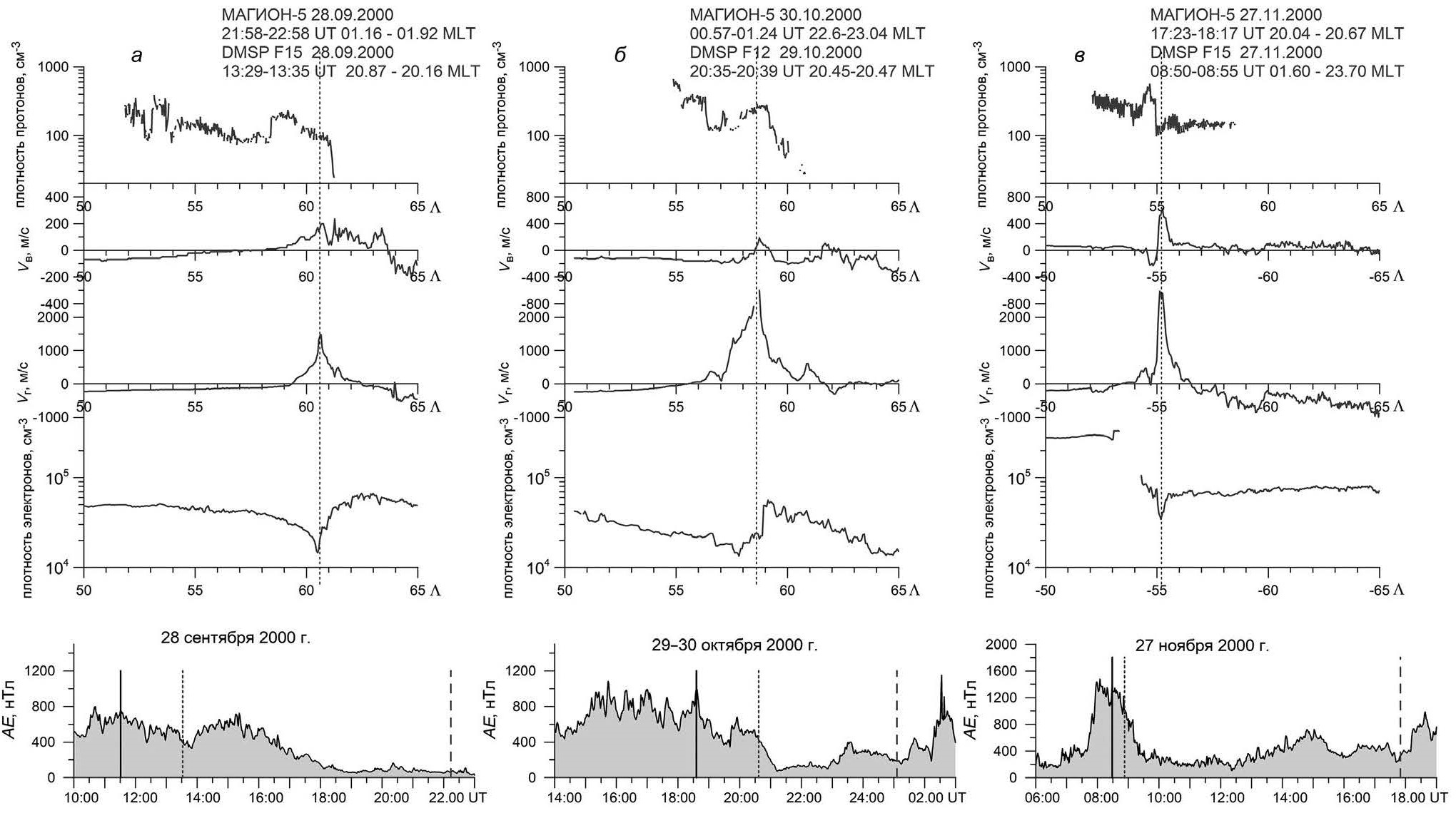 На правых панелях рис. 4 показаны данные, полученные 27 ноября 2000 г. В области инвариантных широт 54° < Λ < 55° в плазмосфере плотность повышена относительно соседних областей в 3—5 раз. С точностью до 0.5° на той же инвариантной широте за 8.5 часов до регистрации этой области в плазмосфере ионосферный спутник DMSP F15 пересек область развития классического ПД (Vг ~ 2800 м/с, Vв ~ 600 м/с, провал плотности электронов) в околополуночном секторе местного времени в южном полушарии. За ~20 мин до регистрации ПД всплеск индекса АЕ указал на развитие суббури в магнитосфере.