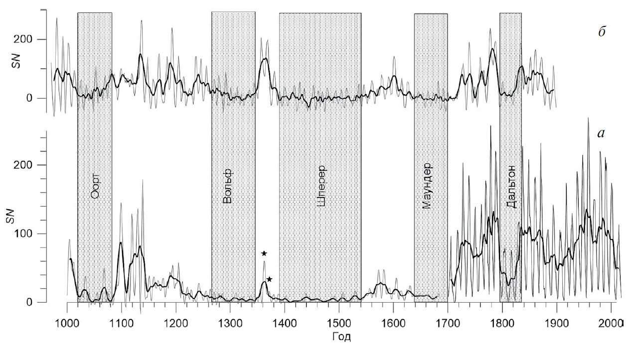 На рис. 2 приведены реконструированные и наблюдательные ряды числа солнечных пятен в 1000—2020 гг. На рис. 2а серой линией c 1000 по 1700 гг. показан ряд SNфил и далее с 1700 г. ряд SNнабл. На рис. 2б также серой линией приведен ряд, полученный по данным о космогенных изотопах SNС14 [Usoskin et al., 2021]. Для каждого ряда было вычислено скользящее среднее окном 10 лет. Результат представлен на рис. 2а, 2б жирными черными линиями. Прямоугольниками выделены гранд-минимумы, о которых подробно будет сказано позднее в этом параграфе. Звездочками отмечены прямые наблюдения пятен на Солнце в Европейской части России [Святский, 2007]. Примечательно, что эти два уникальных случая наблюдения солнечных пятен в Европе зафиксированы во время экстремальных значений гранд-максимума в 1350—1380 гг.