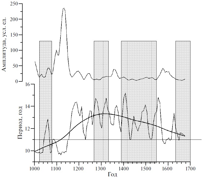 Рис. 4. Изменения периода и амплитуды 11-летней составляющей во времени (1000—1700 гг.). Прямоугольные области соответствуют гранд-минимумам. Черная жирная линия — тренд.