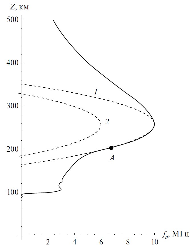 Для дальнейшего моделирования заменим данный профиль параболическим (кривая 1); далее будет показана допустимость такого рода замены в случае прикритических рабочих частот. Зададим вершину параболы в точке максимума слоя (257 км, 9.97 МГц). Потребуем, чтобы парабола проходила через точку перегиба исходного профиля в слое F2, где вторая производная плазменной частоты по координате равна нулю. Это — точка А с координатами (204 км, 6.75 МГц).