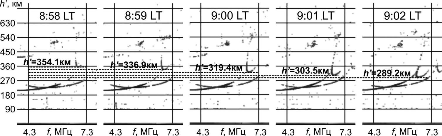 Горизонтальная координата центра возмущения x0 здесь изменяется от 150 до 130 км с шагом 5 км — возмущение приближается к точке зондирования. При уменьшении x0 на 5 км серп становится ниже в среднем на 15.5 км по действующей высоте. Сопоставляя темпы сползания на эксперименте (рис. 3) и при моделировании (рис. 4), нетрудно сделать оценку: для данного события смещение возмущения на 5 км по горизонтали происходит примерно за 1 мин, следовательно, Vгор = 5 км/мин = 83 м/с.