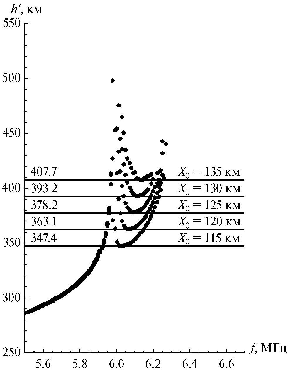 Следует отметить, что значения x0, при которых серп имеет U-образную структуру, здесь меньше, чем на рис. 4. Однако средний темп сползания серпа здесь составляет 15.1 км на каждые 5 км смещения возмущения по горизонтали, а это практически совпадает с темпами сползания на рис. 4, полученными для исходного профиля (рис. 1, кривая 1). Совпадение объясняется тем, что несмотря на существенную разницу критических частот профилей, отражения для частот, отвечающих серпам, происходят примерно на тех же высотах, и относительные изменения группового пути при движении возмущения идентичны. Более того, моделирование показывает, что при уширении или сужении параболы (но при неизменной высоте максимума) темпы сползания также меняются слабо. Иная ситуация имеет место, когда меняется высота максимума слоя, — высоты отражений теперь меняются значительно, что приводит к существенным изменениям темпов сползания. Таким образом, дальнейшая задача сводится к получению зависимости темпов сползания серпа от высоты максимума слоя.