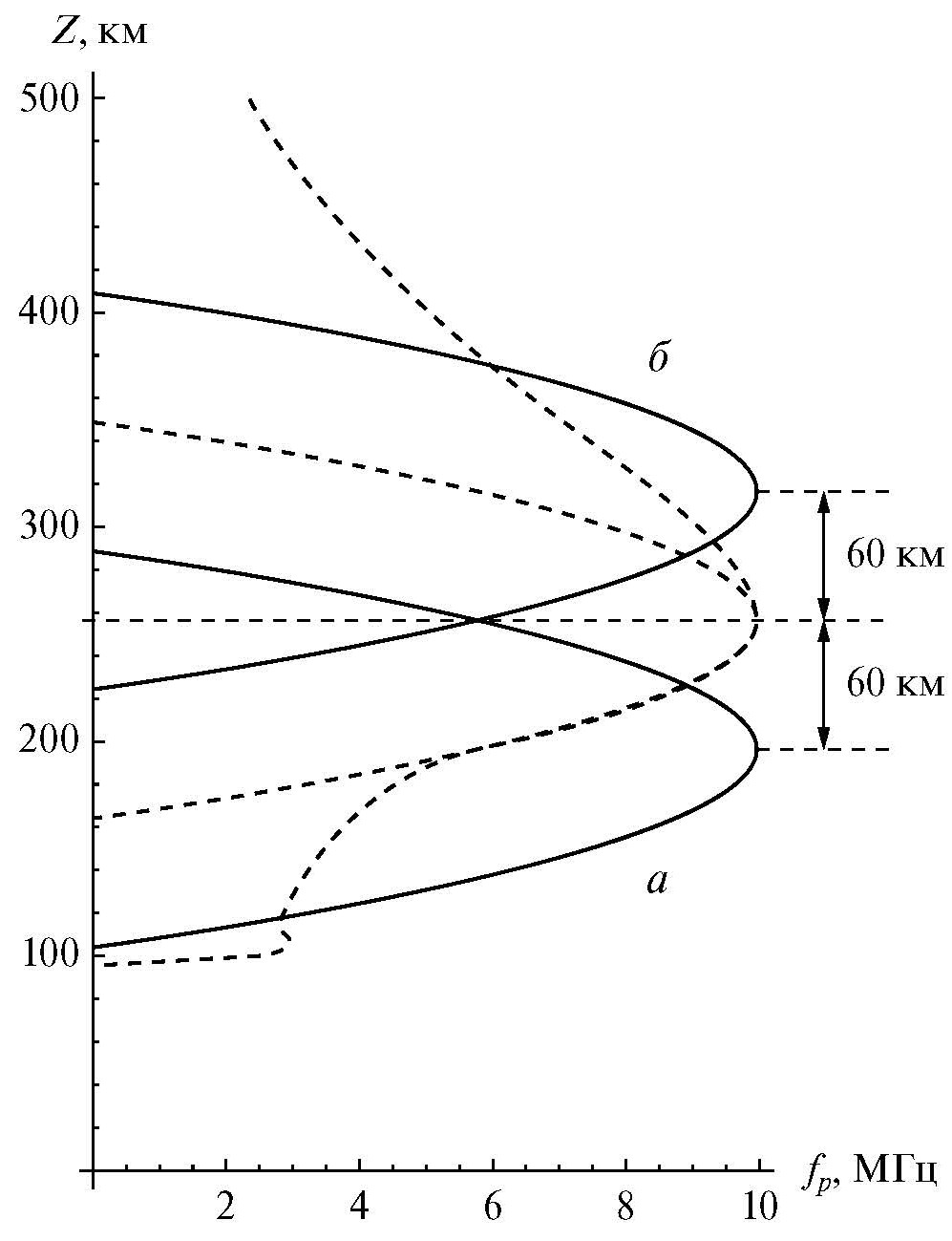 При увеличении высоты максимума слоя, напротив, наблюдается замедление сползания серпа. Так, для Zmax = 287 км имеем 14.3 км на каждые 5 км, при Zmax = 317 км (рис. 6, кривая б) — 13 км на 5 км.