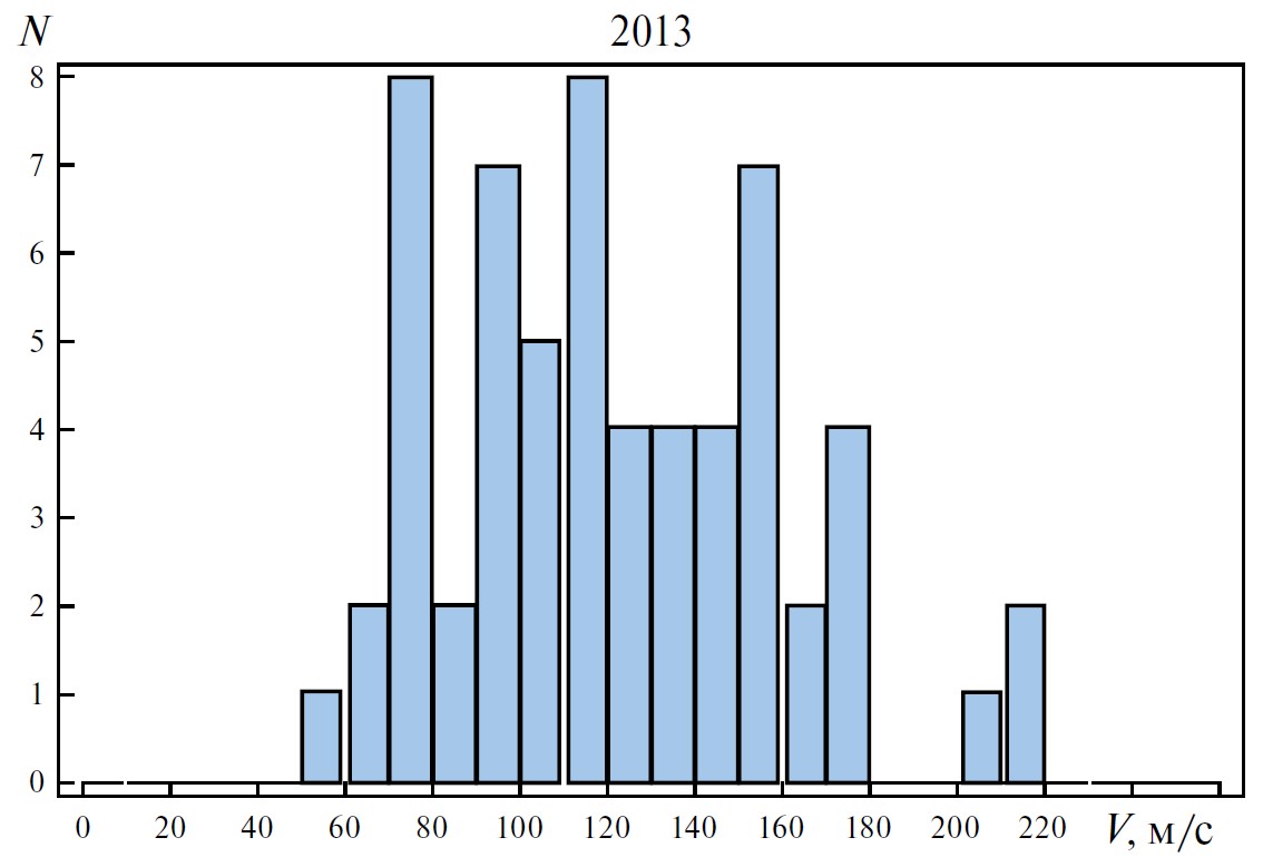 На рис. 9 представлены гистограммы для января 2013 г. (61 событие), января 2016 г. (179 событий) и января 2022 г. (133 события): по вертикали отложено число событий N, соответствующее данному интервалу скоростей. Например, в январе 2013 г. было зафиксировано семь событий, для которых скорость горизонтального движения возмущения лежит в интервале от 90 до 100 м/с. Расчет скоростей горизонтального движения ПИВ проводился по описанной выше методике. Можно видеть, что средние и медианные значения составляют ~110 м/с, при этом распределение довольно широкое — среднеквадратичное отклонение приблизительно равно 40 м/с (табл. 2).