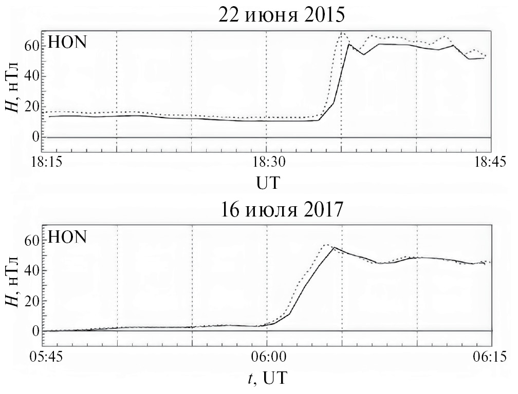 Рис. 1. Примеры данных наблюдений Н-компоненты геомагнитного поля на низкоширотной станции Гонолулу (HON) с минутным (тонкая сплошная линия) и секундным (пунктирная линия) разрешением для оценки начала SSC: на верхней панели – для события от 22 июня 2015 г. в 18:33 UT, на нижней панели – 16 июля 2017 г. в 05:59 UT.