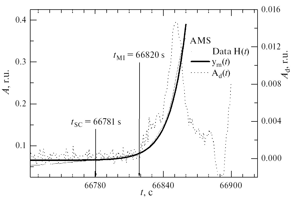 Начало регистрации SC магнитной обсерватории определялось как начало медленного роста значений горизонтальной Н-компоненты магнитного поля Земли. Этот момент времени мы выбрали в качестве времени tSC начала регистрации SC на магнитной станции. При этом начало регистрации SC находили как визуально, так и из анализа численных производные по времени Hd(t). Для некоторых станций, где на временных масштабах ~±2 мин от момента начала MI нет четко выраженных экстремумов и/или выраженных участков подьёма/спада значений горизонтальной компоненты геомагнитного поля (элементов тонкой структуры SC), но при этом Н-компонента поля отчетливо принимает минимальное значение, SC находили визуально как момент начала роста значений Н-компоненты поля. Часто для отдельных станций между началом регистрации SC и MI располагался небольшой экстремум Н-компоненты поля (для станции AMS на рис. 2 этот экстремум выражен очень слабо). В таком случае начало регистрации SС определяли по минимуму Hd(t). В том случае, когда tSC визуально или путем анализа Hd(t) однозначно выделить не удавалось, мы аппроксимировали Hn(t) на малых временных масштабах ±(1‒2) мин от момента начала MI аналитическими экспоненциальными функциями вида ym(t) = y0+A·exp((t-t0)/τ). Параметры аппроксимирующей функции подбирались так, чтобы обеспечить наилучшее согласие между поведением в зависимости от времени этой функции и измеряемой зависимости Hn(t). Так, например, для станции AMS (жирная линия на рис. 2) параметры ym(t) составили y0 = 0.067, A = 0.12946, x0 = 66846 с, τ = 13 с, при этом коэффициент корреляции составил r2 = 0.42. На рис. 2 видно, что в момент времени t < tMI функция ym(t) пересекает Hn(t). Это время мы определили как начало регистрации SC на исследуемой магнитной станции.