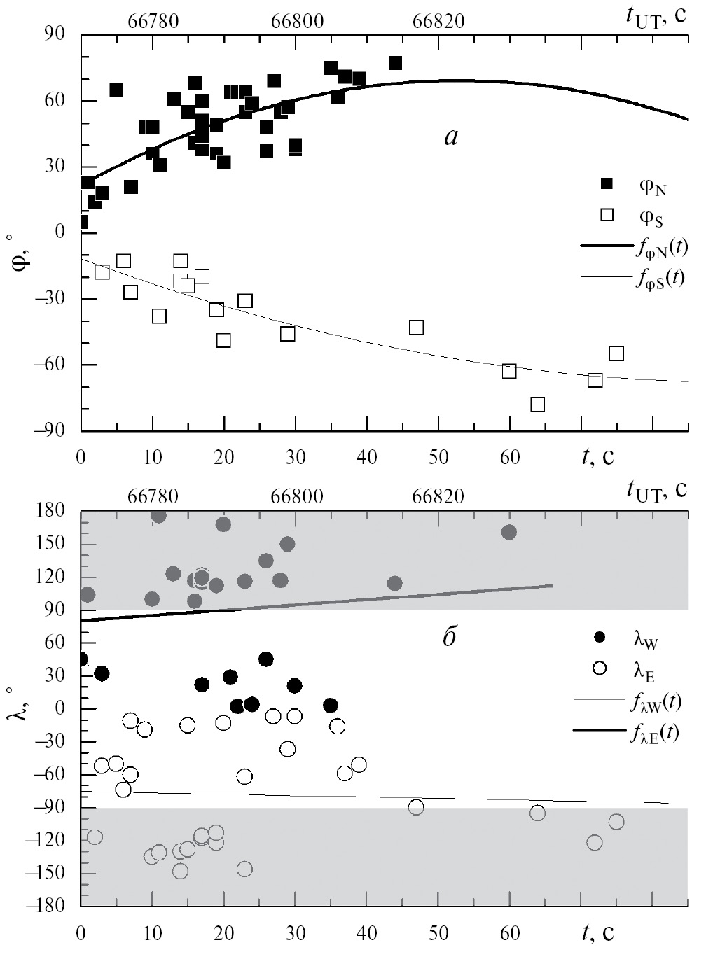 На зависимостях разности географической долготы станции и “полуденной линии” λ от момента начала регистрации SC во всех случаях наблюдается слабый квадратичный тренд, причем более слабый для станций на долготах восточнее “полуденной линии” (см. рис. 8б). Так, для станций, расположенных на момент начала SC на долготах восточнее “полуденной линии” – fλE(t) = 0.039·t2 – 2.9156·t –52.885 (коэффициент корреляции r = –0.42), западнее – fλW(t) = –0.0478·t2 + + 5.8656·t – 47.144 (коэффициент корреляции r = 0.67). На рис. 8б видно, что станция AMS на момент наблюдения SC-события находилась в долготном секторе ∆λ от 0° до –90°, т.е. на освещенной Солнце восточной части полушария Земли. Спустя ~160 с с момента начала регистрации SC на станции AMS все станции, находящиеся западнее “полуденной линии”, находились на ночной стороне Земли. В то время как на станциях, находящихся восточнее “полуденной линии”, наблюдалось утреннее время (вблизи восхода Солнца).
