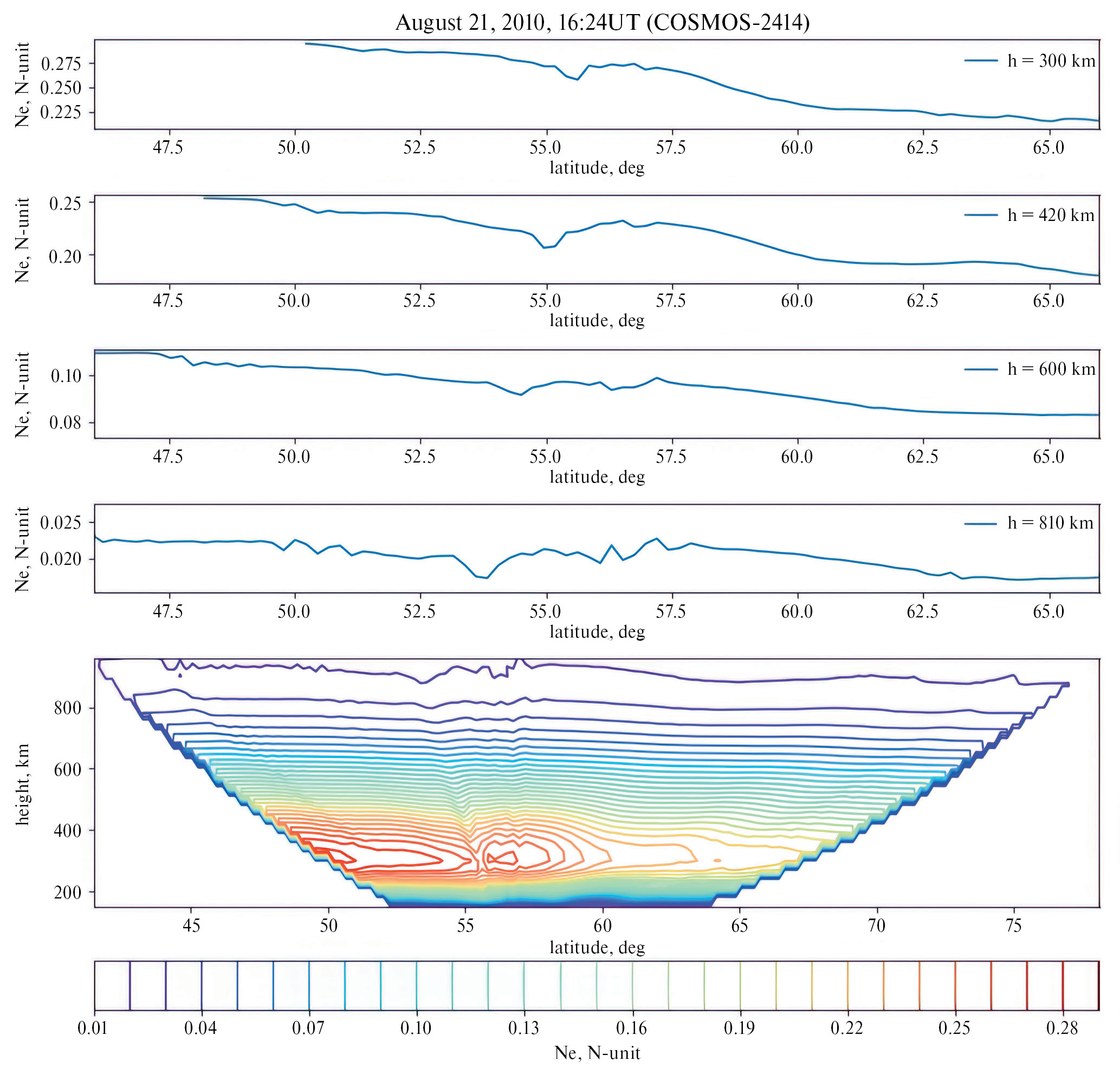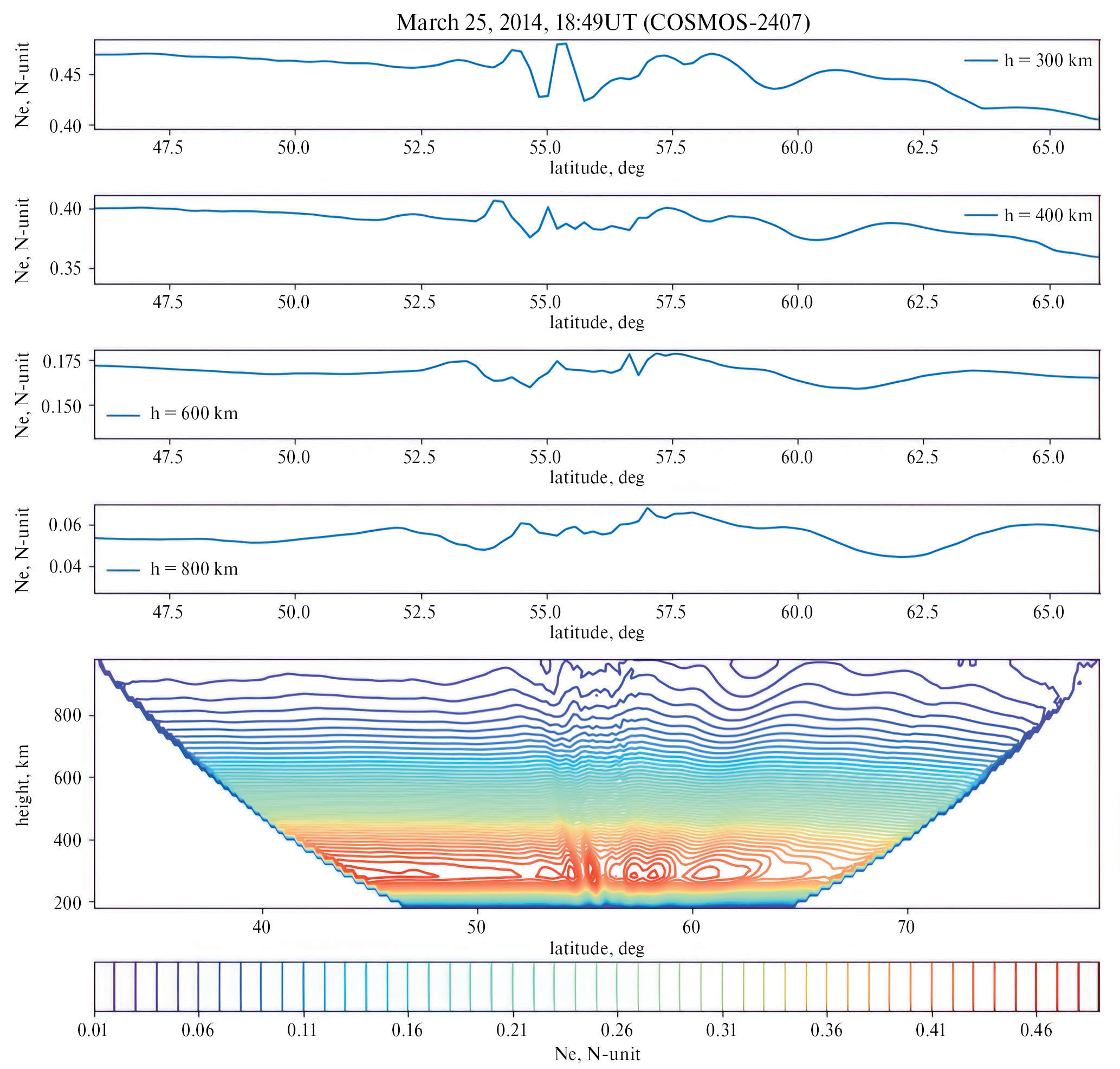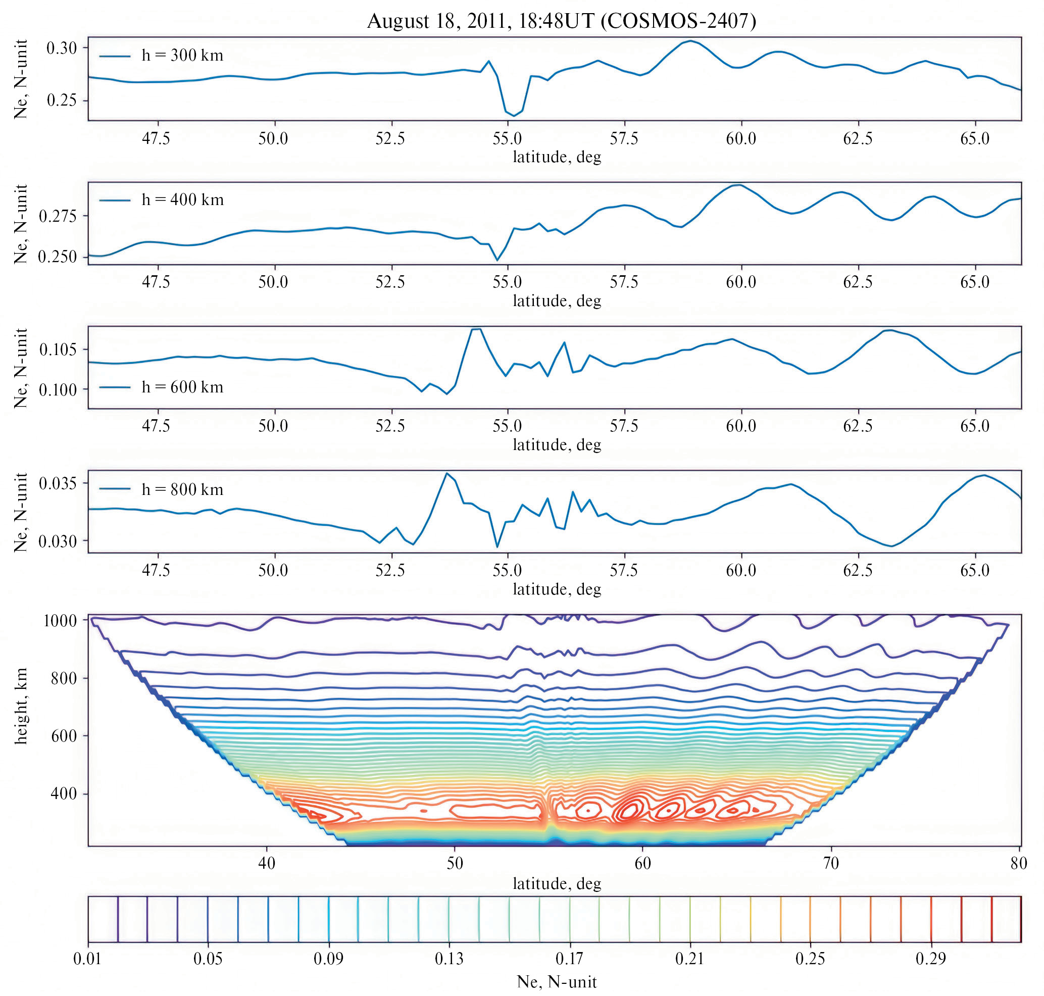 На рис. 1 на примере одного из наиболее удачных сеансов измерений демонстрируются возможности предлагаемого метода [Kunitsyn et al., 2012]. На нем (внизу) приведена радиотомограмма, полученная 18 августа 2011 г. в предполуночные часы в 18:48 UT (в 22:48 мск за 3 мин до окончания импульса излучения ВН) с использованием радиосигналов спутника COSMOS-2407, которая построена с помощью изолиний плотности плазмы, нормированных на 1012 эл/м3. На четырех панелях в верхней части рисунка сверху вниз приведены значения концентрации плазмы на высотах 300, 400, 600 и 800 км, что дает необходимую информацию о характере ее изменения с высотой. Модификация ионосферы в этом сеансе измерений проводилась с 21:01 до 22:51 мск с использованием периодического излучения мощной радиоволны в режиме [± 10 мин]; воздействие осуществлялось на частоте ВН 4785 кГц с эффективной мощностью излучения Рэфф ≈ 50 МВт при критической частоте F2-слоя foF2 ≈ 5.2 МГц. Измерения выполнялись в спокойных геомагнитных условиях: суммарное суточное значение Кр-индекса ∑Кр = 11+ при индексе АЕ ≈ 50 – 100 нТл. Ионозонд, расположенный на стенде СУРА, зарегистрировал возбуждение Fspread среднего уровня (с уширением ветвей ионограмм по частоте до ~ 0.5 МГц), что указывает на достаточно большую эффективность взаимодействия мощной радиоволны с плазмой верхней ионосферы Земли и генерацию в ВОЦ неоднородностей с поперечными к геомагнитному полю размерами l⊥ от нескольких сотен метров до нескольких километров. Максимальный угол возвышения спутника для всех трех используемых в этих измерениях приемных пунктов составлял около 85°, при этом лучи от приемников на спутник проходили через край диаграммы направленности излучения ВН по близким подионосферным траекториям. Предварительный анализ экспериментальных данных, полученных в этом сеансе измерений, был представлен в работах [Фролов и др., 2023; Kunitsyn et al., 2012].