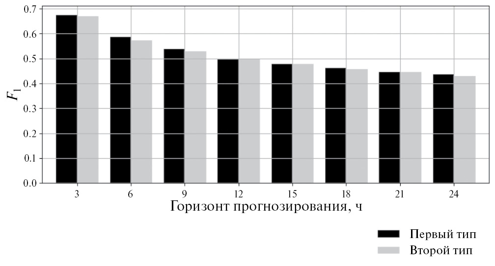 На рис. 5 представлены результаты, аналогичные результатам рис. 4, однако полученные для моделей второго типа, обученных только на данных 24 цикла СА. Для большинства горизонтов результаты моделей второго типа оказались несколько хуже, чем результаты моделей первого типа: метрика F1 от 0.672 при горизонте в 3 часа и 0.576 при горизонте в 6 часов до 0.432 для горизонта в 24 часа.