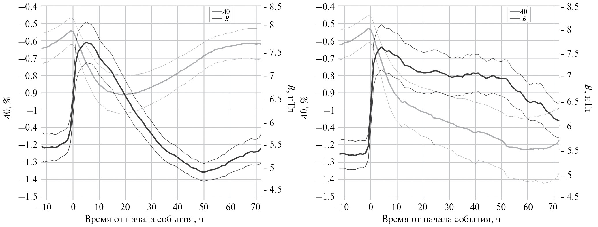Рис. 1. Поведение плотности потока КЛ жесткостью 10 ГВ (А0, серая кривая, левая шкала) и величины ММП (B, черная кривая, правая шкала) в изолированных (левая панель, 2118 событий) и взаимодействующих событиях (правая панель, 1740 событий). Тонкими линиями соответствующих цветов показано отклонение ±σ.