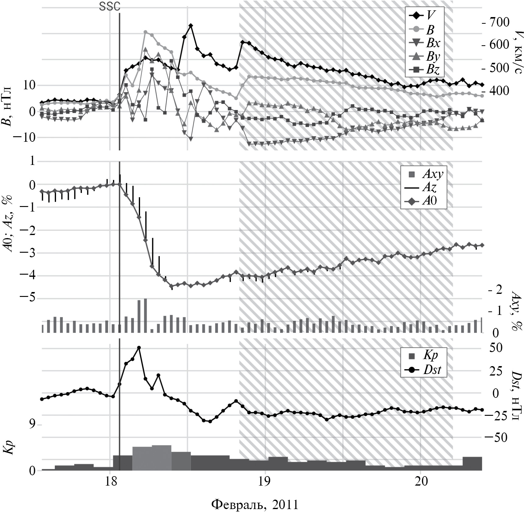 На рис. 3 приведено поведение основных параметров межпланетной среды, КЛ и ГА в событии 18–20 февраля 2011 г., вошедшем в группу MIX CME. Источником данного межпланетного возмущения стали несколько ассоциированных со вспышками КВМ, происходивших 14–15 февраля 2011 г. в АО 11158. Самыми значительными из них были два КВМ типа гало, зарегистрированных 14 февраля в 18:24 UT (ассоциирован со вспышкой класса M2.2 в 17:20 UT) и 15 февраля в 02:24 UT (ассоциирован со вспышкой класса X2.2 в 01:44 UT). Более поздний КВМ имел намного большую начальную скорость (669 км/с и 326 км/с соответственно), но произошел в той же АО и распространялся примерно в том же направлении. Это, по-видимому, привело к взаимодействию двух структур в межпланетном пространстве и регистрации у орбиты Земли одного, но сложного и длительного возмущения СВ. Ударная волна была зарегистрирована в 01:30 UT 18 февраля 2011 г., максимальное значение ММП составило Bmax = 30.6 нТл, скорости СВ Vmax = = 678 км/с (см. верхнюю панель рис. 3), наблюдалось МО длительностью 33 часа, начавшееся 18 февраля в 20:00 UT (заштрихованная область на рисунке, данные каталога WIND https://wind.nasa.gov/mfi/mag_cloud_S1.html). Магнитуда соответствующего ФЭ составила AF = 4.5%, максимальное значение экваториальной составляющей анизотропии КЛ Axymax = 1.55%, а максимальное изменение (размах) северо-южной составляющей анизотропии КЛ Azrange = 1.5% (см. среднюю панель рис. 3). В данном событии были зарегистрированы интервалы малой магнитной бури (нижняя панель рис. 3, Kpmax = 5–, Dstmin = –32 нТл).