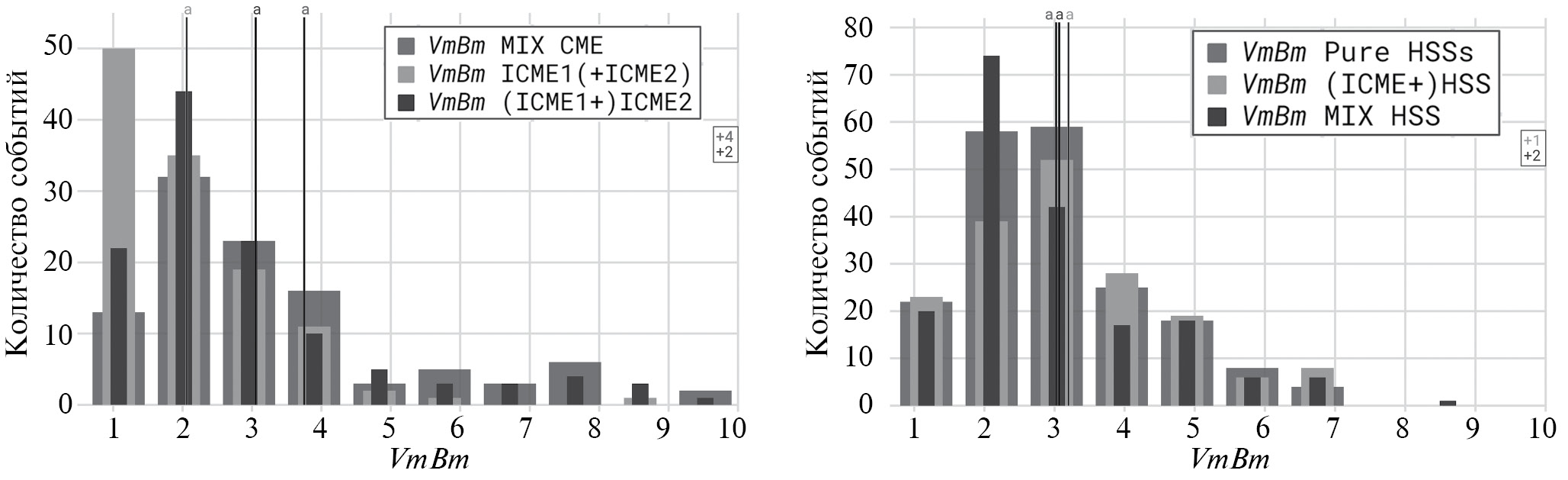 Чтобы описать поведение характеристик СВ и ММП в разных группах событий, рассмотрим более подробно поведение нормированного параметра возмущенности межпланетной среды, рассчитываемого как , где = 400 км/с и = 5 нТл – параметры невозмущенного СВ [Belov et al., 2001]. На рис. 5 приведены гистограммы, отражающие распределение значений этого параметра в группах событий, связанных с КВМ (левая панель) и потоками плазмы из КД (правая панель). Вертикальные линии, обозначенные буквой a, показывают средние значения соответствующих групп, сбоку в прямоугольнике показано количество событий, не отображенных на рисунке в силу выбранного масштаба.