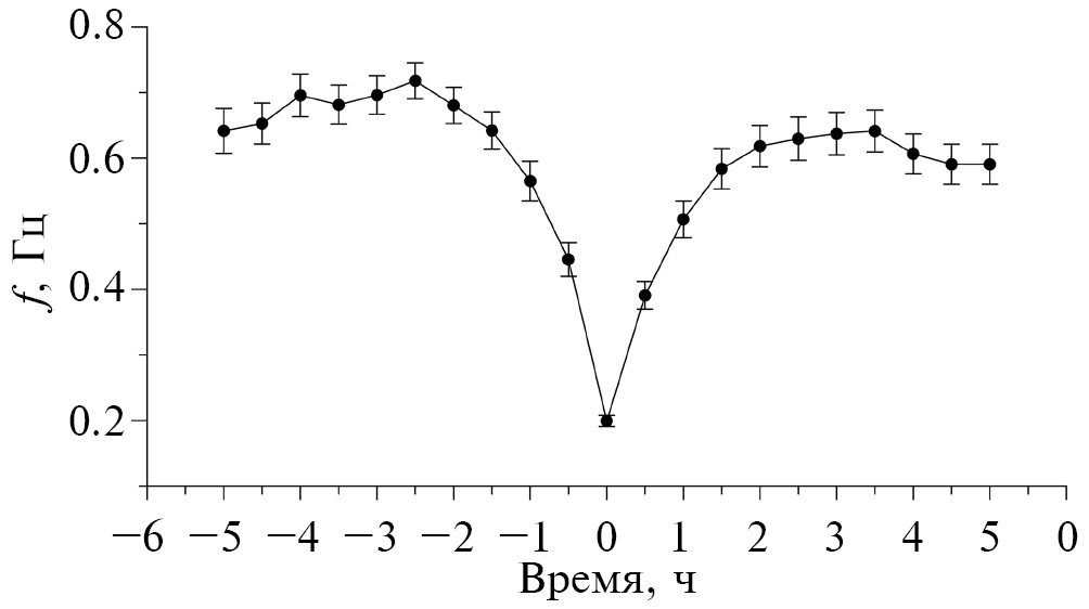 Рис. 2. Динамика несущей частоты (f) SE, полученная методом наложения эпох на интервале времени 5 ч до и 5 ч после момента достижения минимальной величины несущей частоты. Нулевая точка на горизонтальной оси соответствует часу, в котором несущая частотa достигала наименьшего значения fmin. Вертикальными линиями обозначены стандартные ошибки средних значений.