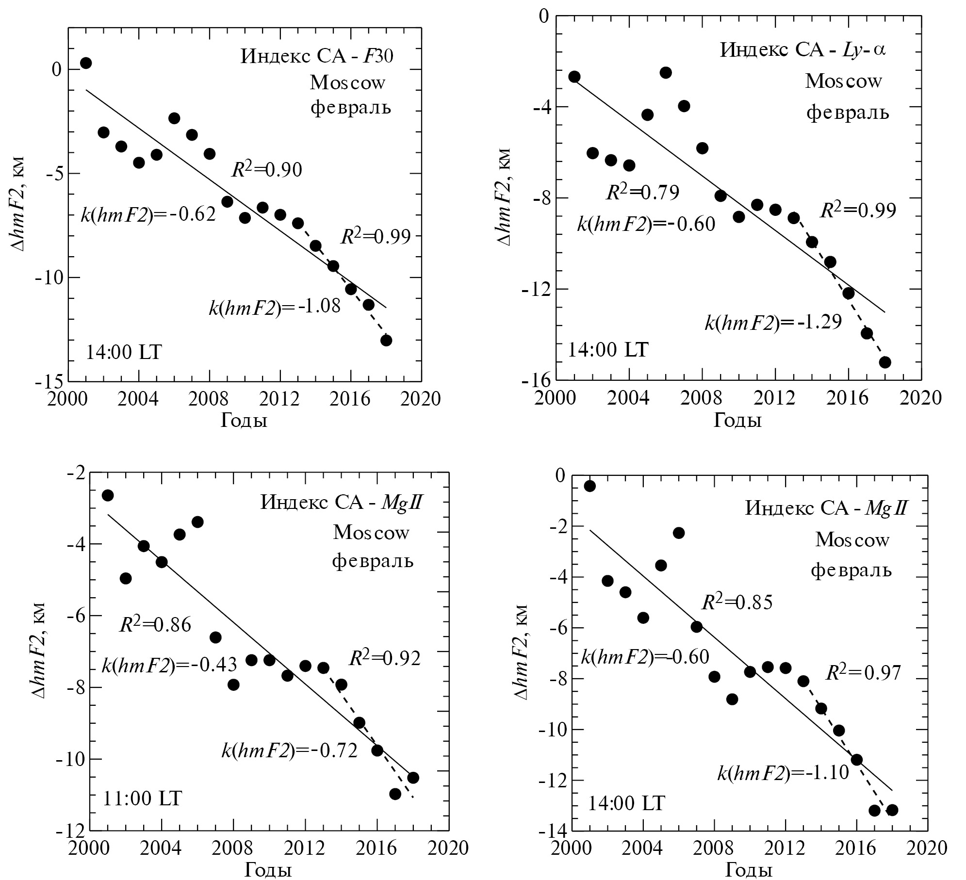 Изменение ΔhmF2 со временем в январе и феврале для ст. Moscow представлено на рис. 1 и рис. 2. Известно (см., например, [Данилов и др., 2023б]), что тренды критической частоты слоя F2, foF2 наиболее выражены в зимние месяцы. Как видно из приведенных рисунков, для всех использованных индексов СА в течение анализируемого периода наблюдается уменьшение ΔhmF2 со временем. Линейная аппроксимация этого уменьшения (сплошная линия) дает отрицательный тренд высоты, k(hmF2). На всех рисунках и во всех таблицах величины k(hmF2) приведены в единицах км/год.