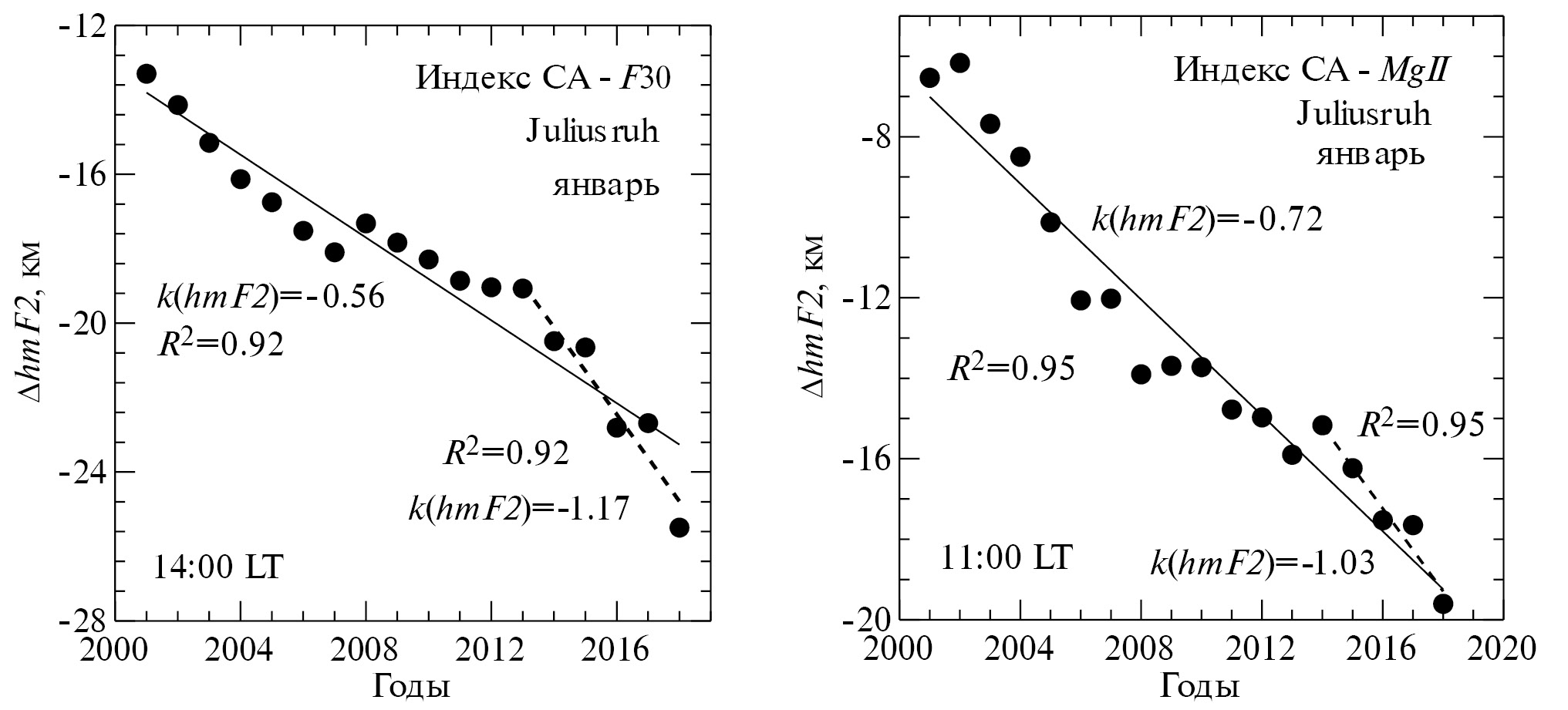 Как видно из этой таблицы, для нескольких моментов LT для февраля мы не смогли определить надежных величин k(hmF2) из-за хаотичного характера изменения величин ΔhmF2 со временем. Однако, для января получены надежные величины тренда для всех моментов LT и всех индексов СА. При этом усредненные по всем моментам LT и всем индексам СА величины k(hmF2) для обоих зимних месяцев различаются не сильно (–0.44 и –0.56 км/год), что позволяет надеяться, что даже для февраля получены правильные значения.