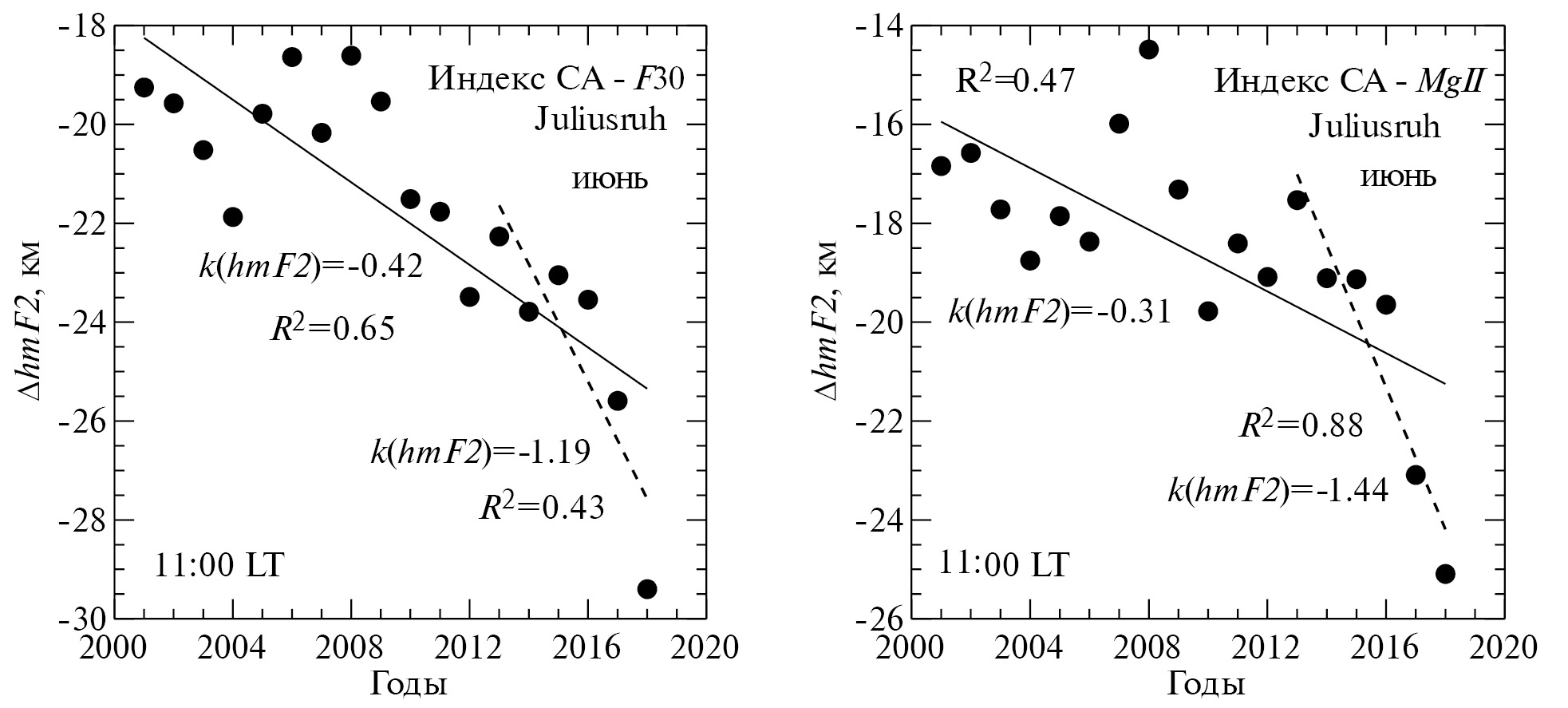 Мы провели также анализ трендов hmF2 для типичного летнего месяца июня. Результаты приведены в табл. 6. Видно, что величины k(hmF2), полученные для июня усреднением по всем моментам LT и всем индексам СА (−0.48 км/год), близки к величинам, полученным для зимних месяцев (−0.44 и –0.56 км/год). Отличительной чертой рисунков для июня на ст. Juliusruh является то, что для недавних лет получаются гораздо более сильные тренды hmF2, чем для того же месяца для ст. Moscow, или для зимних месяцев на ст. Juliusruh.