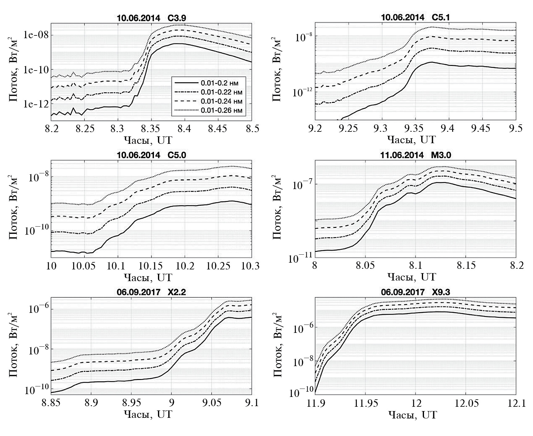 где ℏ – постоянная Планка; с – скорость света; k – постоянная Больцмана; λ – длина волны; T – температура черного тела. Результаты расчета потоков рентгеновского излучения в диапазонах, указанных в табл. 2 для шести солнечных вспышек (табл. 1), показаны на pис. 1.
