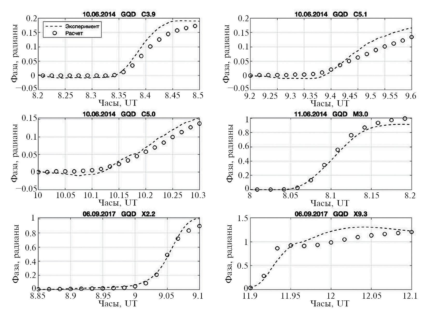 Рис. 5. Сравнение экспериментальных (штриховые линии) и расчетных (кружки) изменений фазы сигнала от передатчиков GQD для 6 вспышек различного класса.
