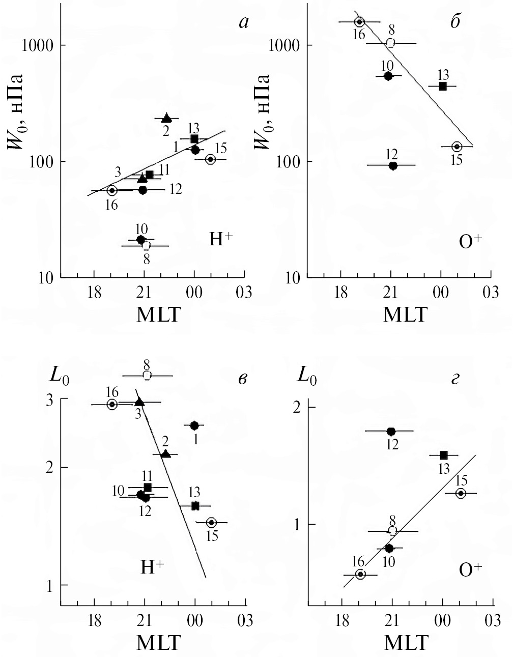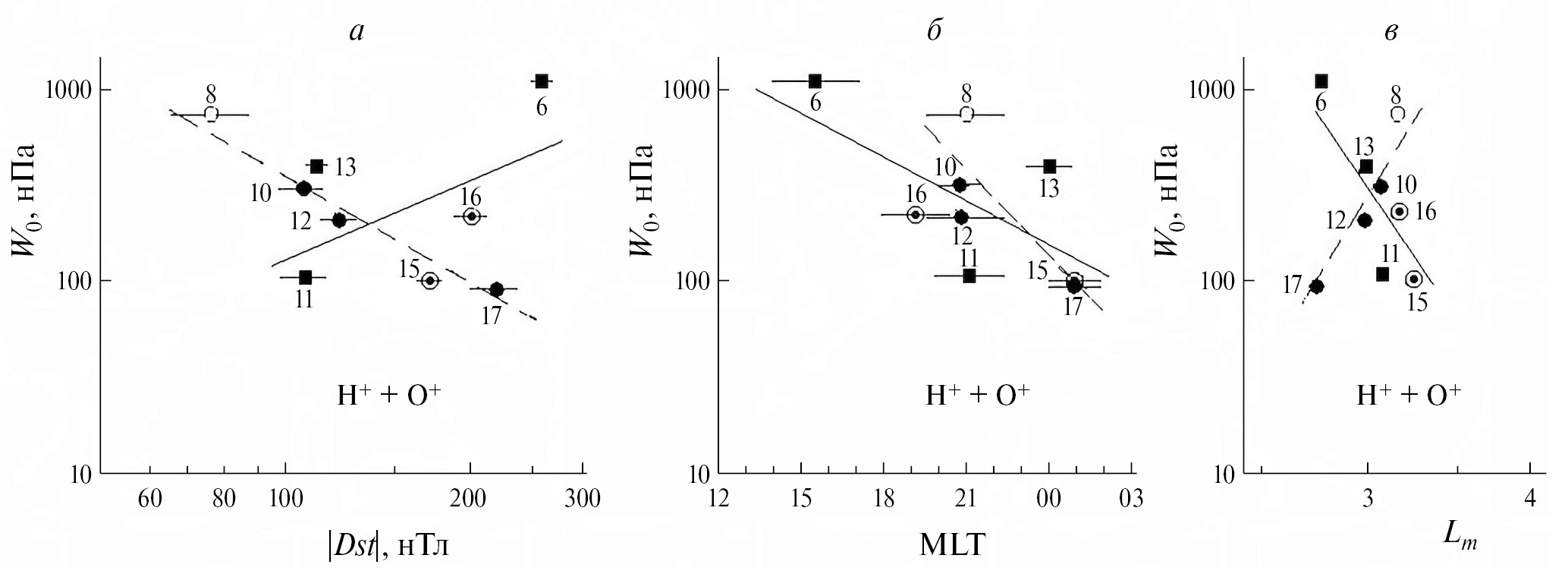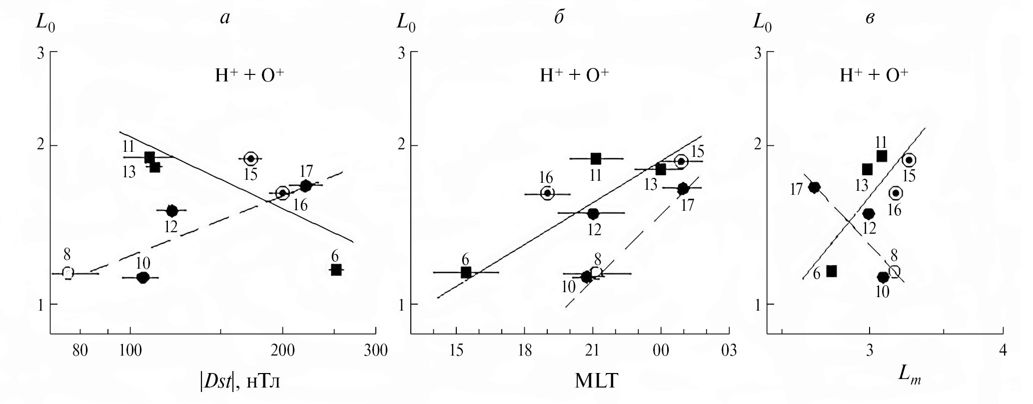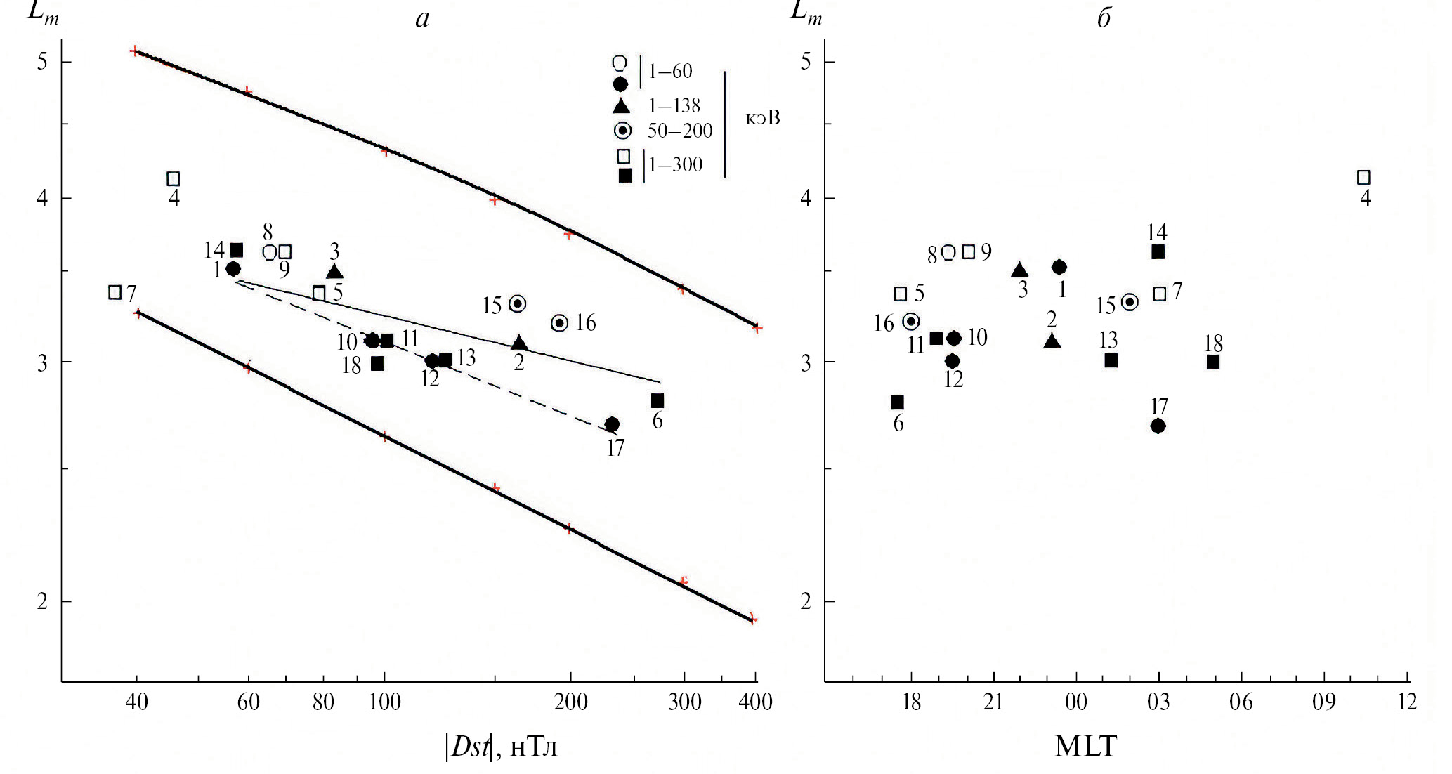 На рис. 1 величины параметра Lm из табл. 1 представлены в зависимости от значения |Dst| и от MLT. Разные значки на этом рисунке отвечают разным энергиям ионов: ~ 1–60 кэВ (кружки), ~ 1–140 кэВ (треугольники), 50–200 кэВ (кружки с темным ядром) и ~ 1–300 кэВ (квадраты). Светлые и темные значки соответствуют середине и концу главной фазы бурь. Их номера отвечают номерам строк в табл. 1. Такие обозначения проведены по всем рисункам данной работы.