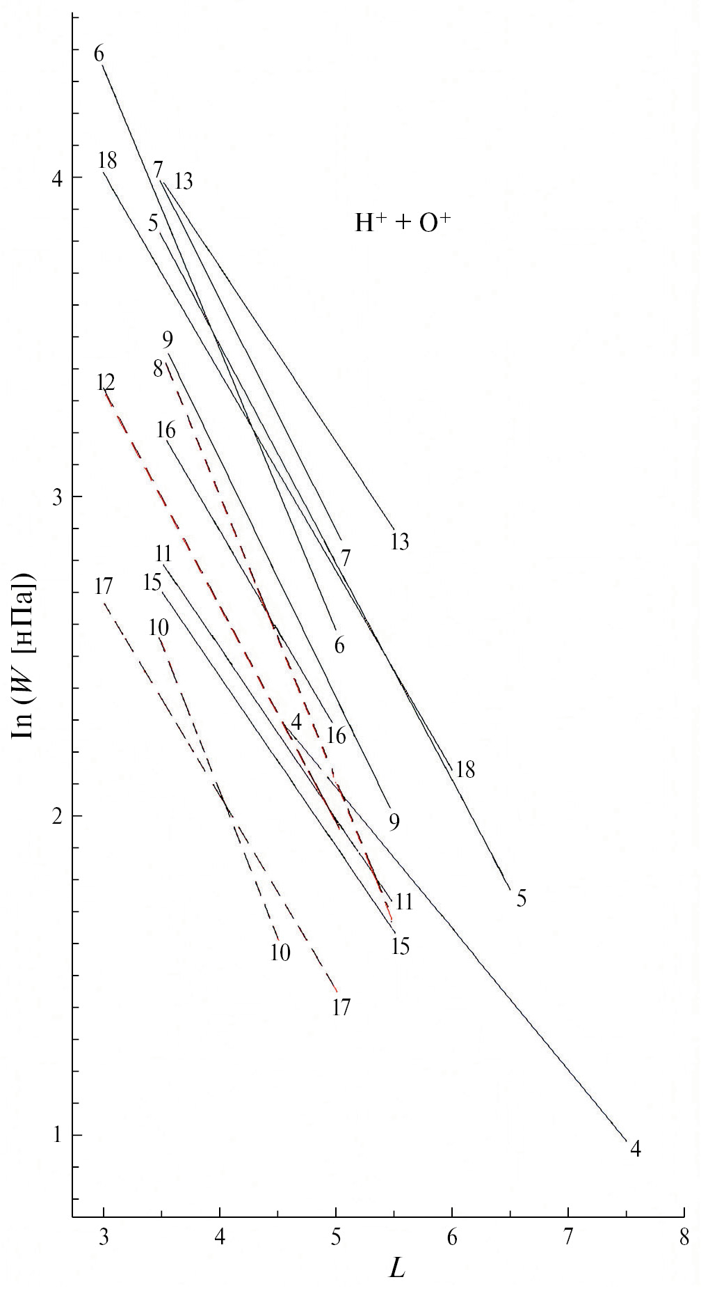 Согласно нашим расчетам, при увеличении MLT от 18 до 24 ч отношение ⟨wO+⟩/⟨wH+⟩ увеличивается от 0.21 до 1.64 (в 7.8 раз) на L = 4, от 0.05 до 1.57 (в 31.4 раз) на L = 5 и от 0.01 до 1.52 (в 152 раза) на L = 6. При 18 MLT доминируют ионы H+ (особенно сильно – на больших L), а при 24 MLT – ионы O+.