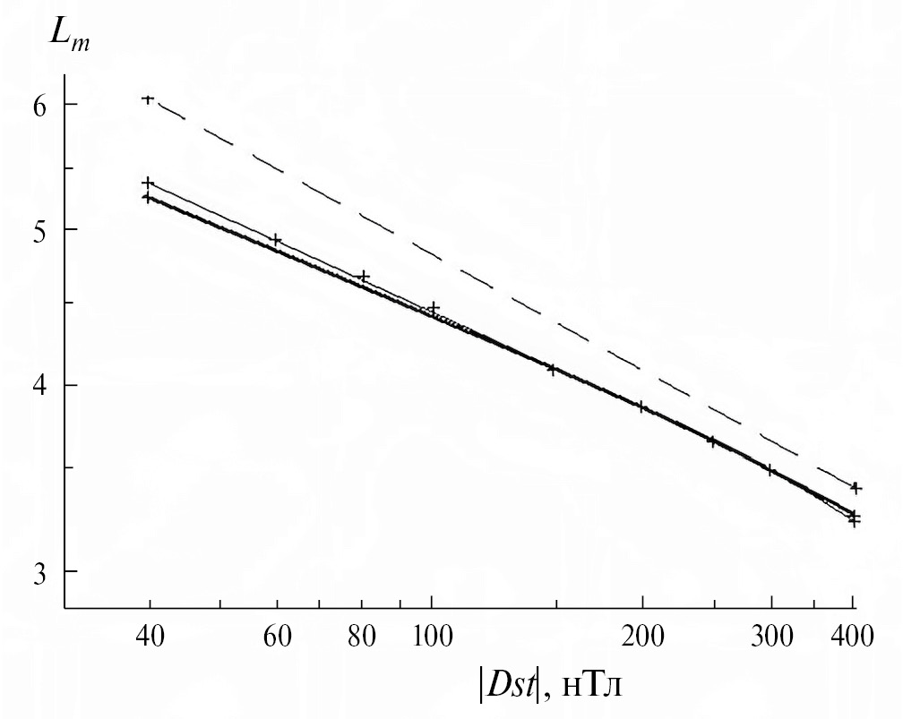 Толстые кривые на рис. 1а – модельные зависимости Lm от |Dst| (см. раздел 4.1).