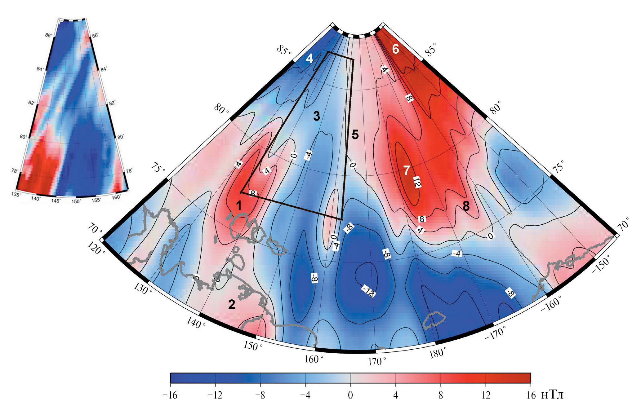 Южнее крупного сегмента положительных значений аномального поля наблюдается обширная область отрицательных значений амплитуды Та, простирающаяся до континентальной области Евразии. На поднятиях Чукотского плато (8), представляющего собой выдвинутый в сторону глубоководного бассейна фрагмент континентальной окраины, амплитуда ЛМА снижается с севера на юг с 9 до 0 нТл. Такой результат выглядит противоречиво, принимая во внимание, что Чукотское плато по современным представлениям рассматривается как относительно неглубоко погруженный аваншельфовый выступ континентальной коры со значительной мощностью (~34 км).