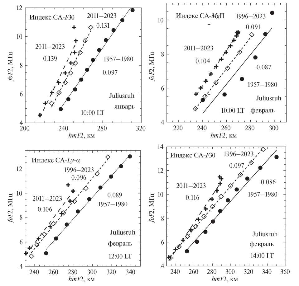 Основной результат предыдущих двух параграфов состоит в том, что для обеих станций (Moscow и Juliusruh) как зимой, так и летом наблюдается увеличение параметра S (наклон зависимости foF2 от hmF2) при переходе от периода 1957–1980 гг. к периоду 1996–2023 гг. и затем к периоду 2011–2023 гг. Анализ проводился для пяти околополуденных моментов LT. Использовались три индекса СА (F30, Ly-α и MgII), которые по нашим данным (см. [Данилов и Бербенева, 2023; Данилов и др., 2023] являются наилучшими для описания поведения foF2.