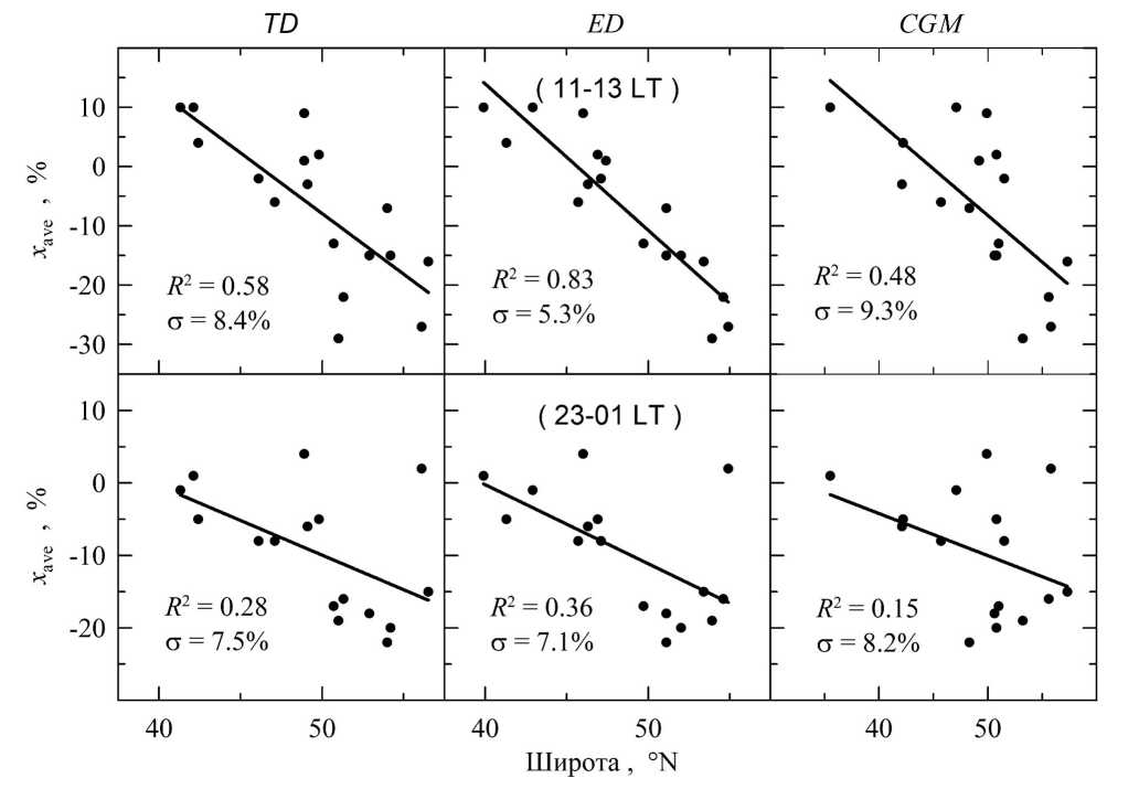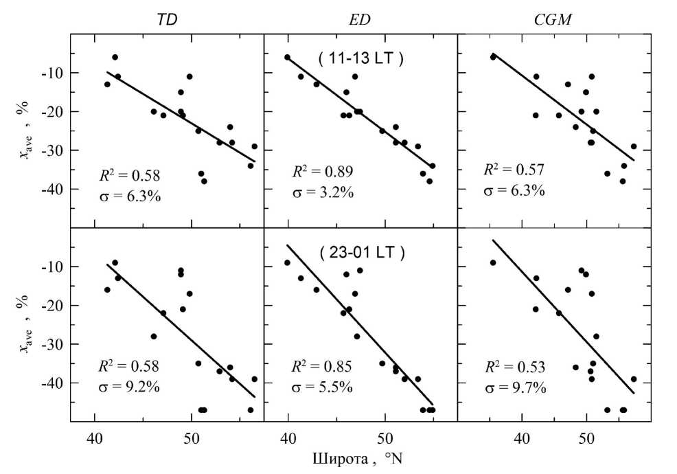 Не менее важным является очень большой диапазон изменений xave между анализируемыми станциями: |xave| = 22±16% и |xave| = 28±19% для дневных и ночных часов. Эффекты ионосферных возмущений в периоды повышенной геомагнитной активности зависят от широты, поскольку источник этих возмущений расположен в высоких широтах. В качестве таких широт можно выбрать широты в координатах ED, TD или CGM и оценить, которая из них является более точной для описания возмущений в ионосфере средних широт в периоды повышенной геомагнитной активности. Для этого по данным xave в таблице 1 были определены коэффициенты уравнений регрессии (a и b) и статистические свойства этих уравнений