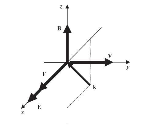 Рассмотрим распространение ВГВ в плоскости . Пусть в этой плоскости расположен волновой вектор k ВГВ, распространяющейся снизу из атмосферы. Параметры волны не зависят от координаты y. Из уравнения (10) следует, что сила Ампера в ионосфере не влияет на распространение волн в направлении поперек направления действия этой силы . Иначе говоря, только компонента силы Ампера, расположенная в плоскости распространения ВГВ, влияет на ее распространение в ионосфере. Будем полагать, что скорость ветра направлена по оси y, а внешнее электрическое поле направлено по оси x, как показано на рисунке 2. Обозначим: . Согласно равенствам (13), величина компоненты силы в плоскости распространения волны (x, z) определяется формулой: