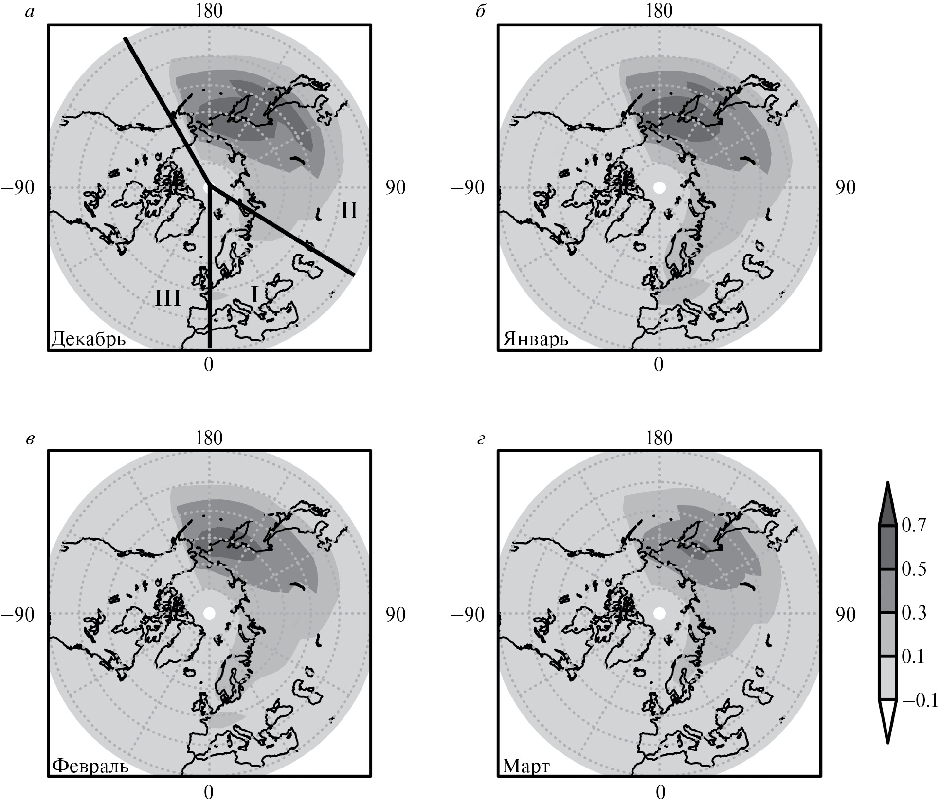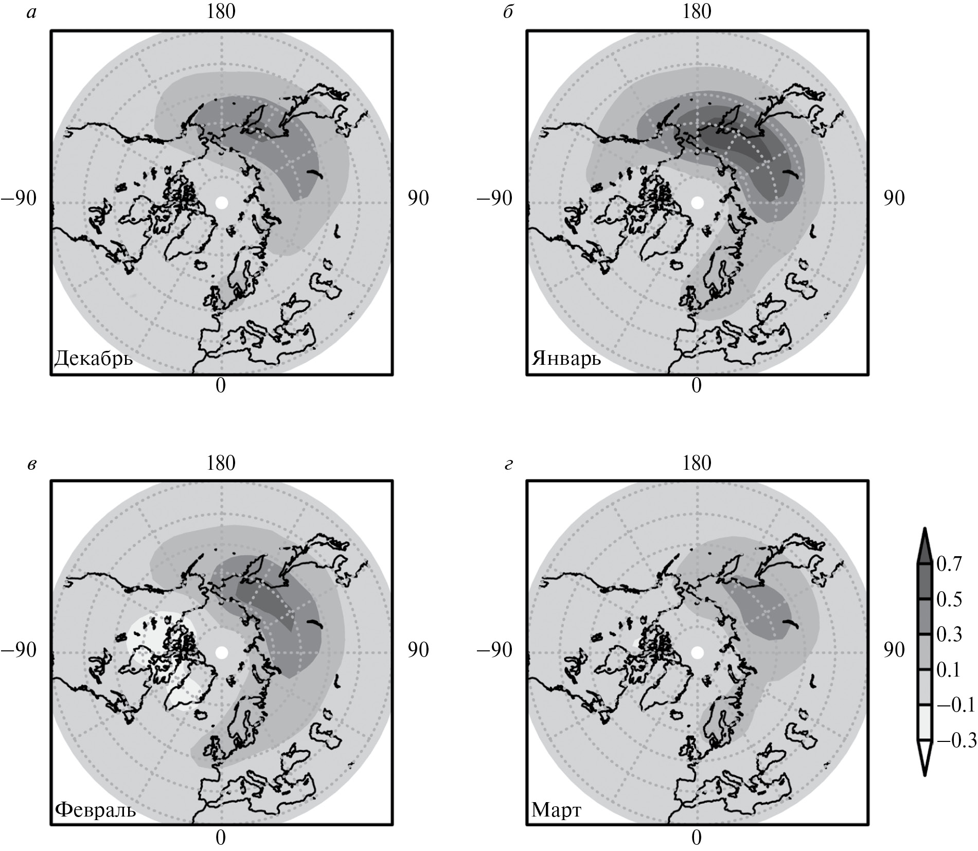 Для примера, на рис. 2 показаны усредненные за 10 лет (2008−2017 гг.) значения вертикальной компоненты потока волновой активности для месяцев с декабря по март. Нисходящие потоки волновой активности из стратосферы в тропосферу наблюдаются над Гренландией и севером Канады, но значения практически на порядок меньше в сравнении со значениями восходящих потоков.