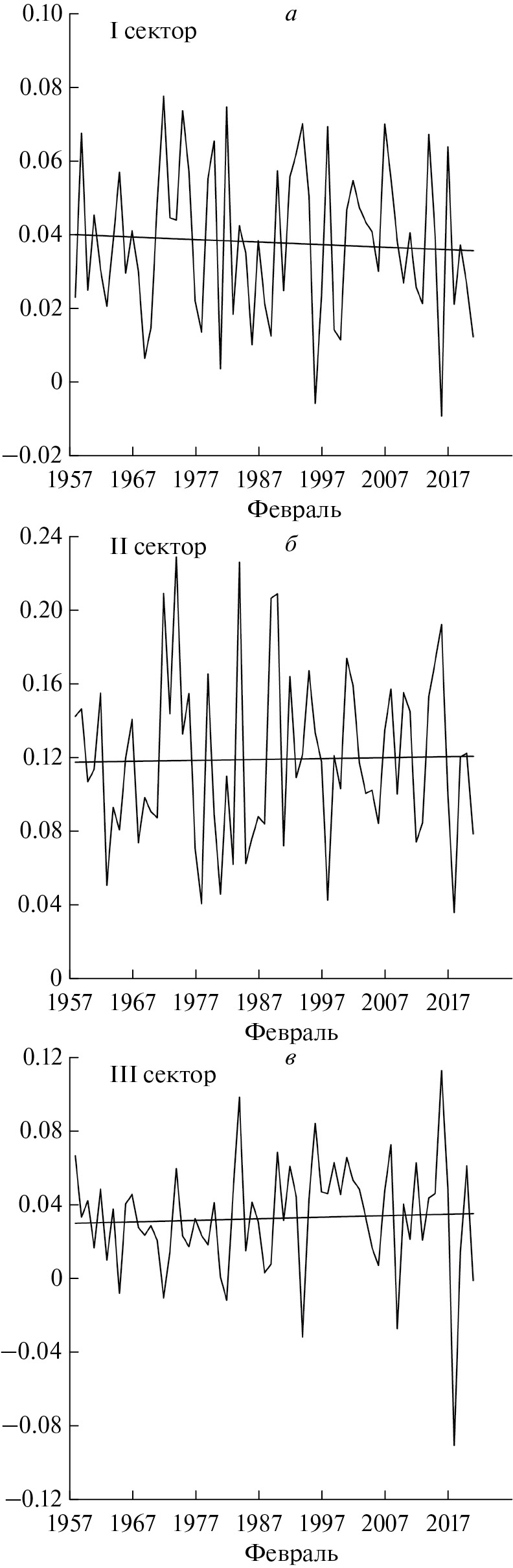Отсутствие статистически значимых трендов в феврале за период с 1958 по 2021 гг. показано на рис. 6. Выводы не меняются при анализе результатов расчета с 1980 г. Здесь стоит отметить, что за все исследуемые годы и месяцы, в феврале в I и III секторе наблюдаются максимальные значения нисходящего потока волновой активности в 2015 г. и 2017 г. соответственно; максимальные значения потока волновой активности из тропосферы в стратосферу во II (1973 г. и 1989 г.) и в III секторах (2015 г.).