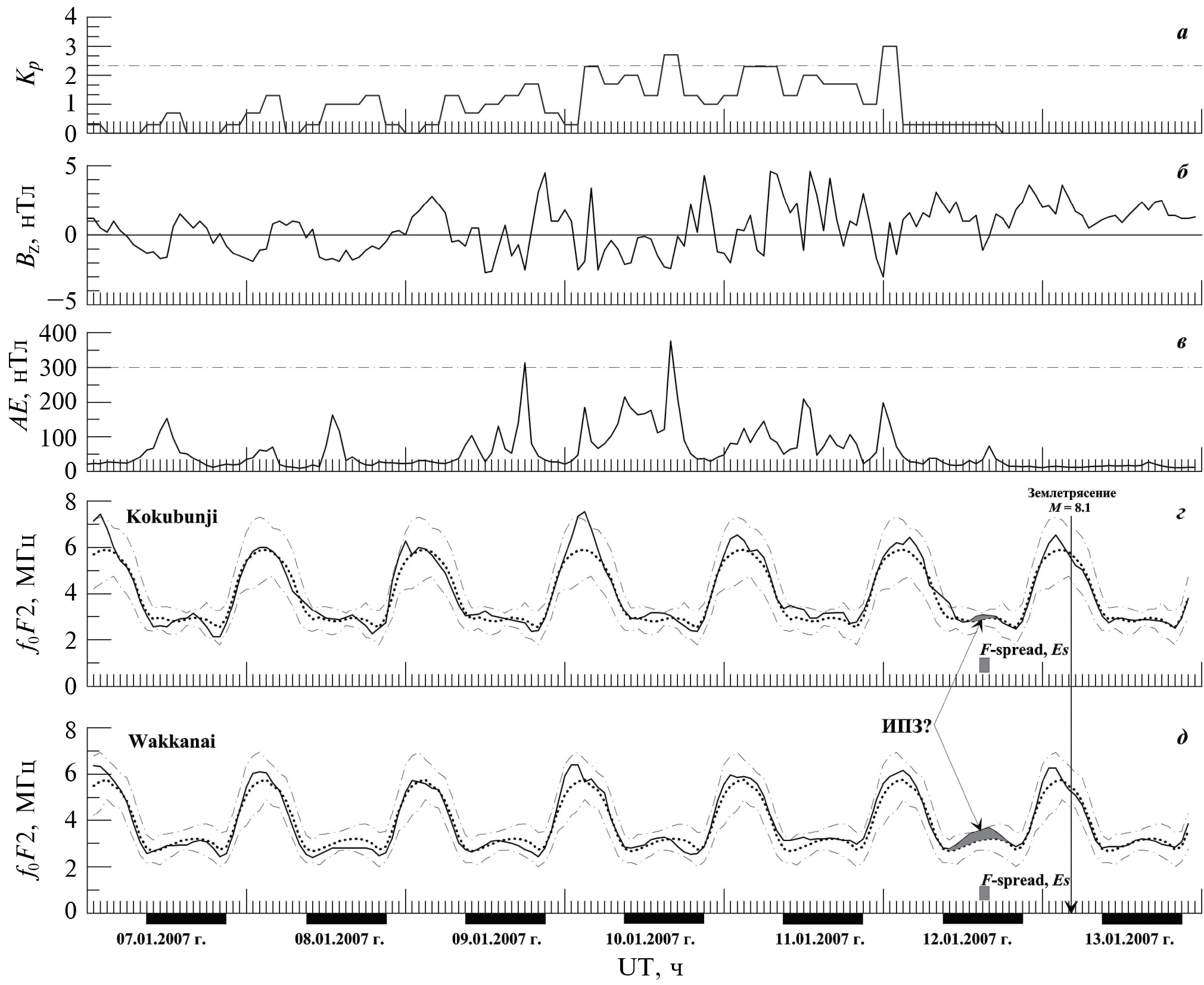 На рис. 1 представлены географические положения эпицентра землетрясения с M = 8.1, случившегося 13 января 2007 г. (треугольная звезда), а также расположение ионосферных станций Wakkanai и Kokubunji (черные кружки). Эпицентральные расстояния до станций по дуге большого круга указаны около соответствующих стрелок, а радиус зоны подготовки RD ≈ 3000 км показан над рисунком. Толстые сплошные линии определяют положения границ плит в области поглощения литосферы (см. также монографию [Апродов, 2000]), тонкими сплошными линиями очерчены о-ва Японского архипелага. Из рисунка ясно видно, что ионосферные станции находятся глубоко внутри зоны подготовки этого землетрясения. Укажем здесь сразу также, что согласно сведениям The National Weather Service (NWS), U.S. (https://www.swpc.noaa.gov/products/solar-cycle-progression), среднее значение индекса F10.7, характеризующего солнечную активность, в январе 2007 г. составило 83.76 SFU, а сглаженное среднее – 78.1 SFU, т.е. солнечная активность была низкой. Соответственно, можно было ожидать и низкой геомагнитной активности на достаточно длинном временном интервале в пределах этого месяца, что снижает вероятность развития возмущений в ионосфере, обусловленных магнитными бурями. На приведенном ниже рис. 2 сплошными линиями отображены изменения геофизических индексов (панель а – Kp; панель б – Bz-компонента межпланетного магнитного поля; панель в – AE), а также часовых вариаций значений текущих критических частот foF2cur на ст. Kokubunji (панель г) и ст. Wakkanai (панель д) на семидневном временном интервале с 7.01.2007 г. по 13.01.2007 г. Длинной вертикальной стрелкой (проходящей через панели г и д и пересекающий их оси абсцисс) отмечен момент землетрясения, а зачерненными прямоугольниками под ней – интервалы местного времени с 18:00 до 6:00 LT. Последнее сделано для того, чтобы было видно, когда наблюдается предполагаемый ИПЗ – в освещенные/неосвещенные часы. На панелях г и д линии, данные “точками”, соответствуют медианным значениям по 13 геомагнитно-спокойным (Q) дням января месяца (foF2medQ), когда в течение целого дня величина Kp-индекса не превышала значения 2+ (этот же уровень отмечен на панели а горизонтальной штрихпунктирной линией), а штрихпунктирными линиями задан интервал foF2medQ ± 1.5IQR (IQR – разность между верхним (75%-ным) и нижним (25%-ным) квартилями, т.е. межквартильный диапазон – Inter Quartile Range). Выделенные темной заливкой области превышения foF2cur над foF2medQ отмечены стрелками как возможные ИПЗ, а небольшие прямоугольники того же цвета у осей абсцисс соответствуют интервалам времени, когда на обеих станциях одновременно наблюдалиcь F-рассеяние и спорадический слой Es.